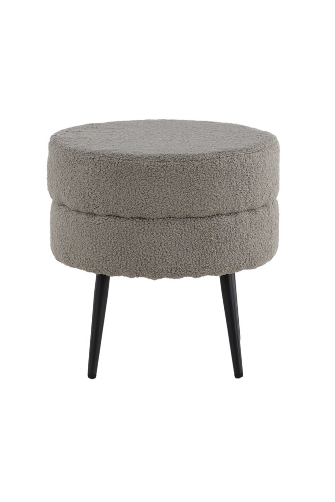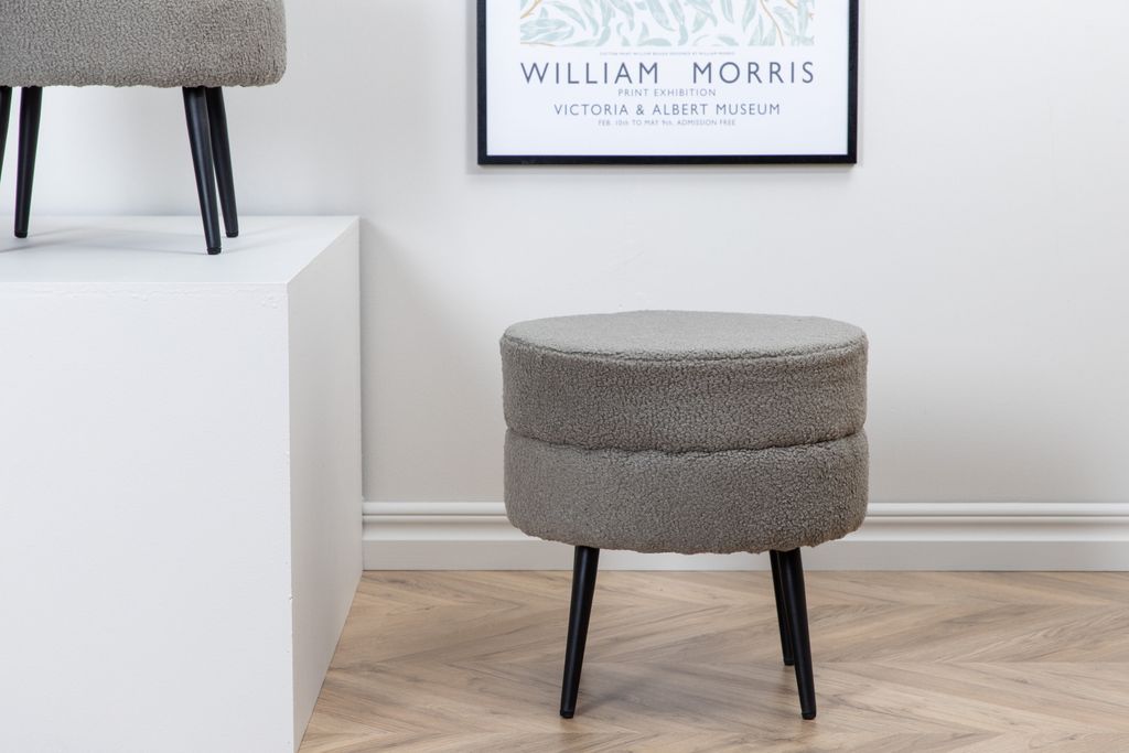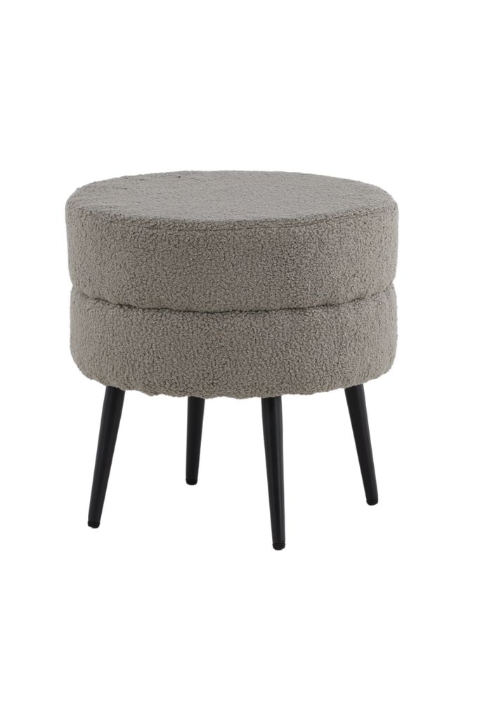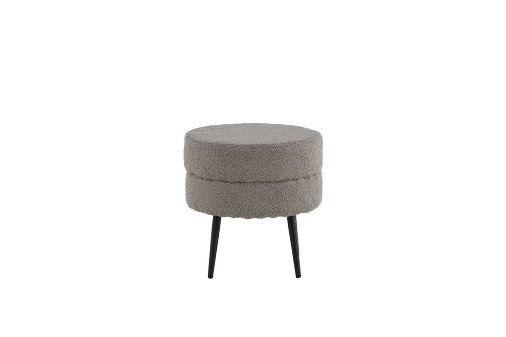 Elegant och diskret sittpuff i trendigt teddytyg med svart stålben, perfekt för både extra sittplats och inredningsdetalj.