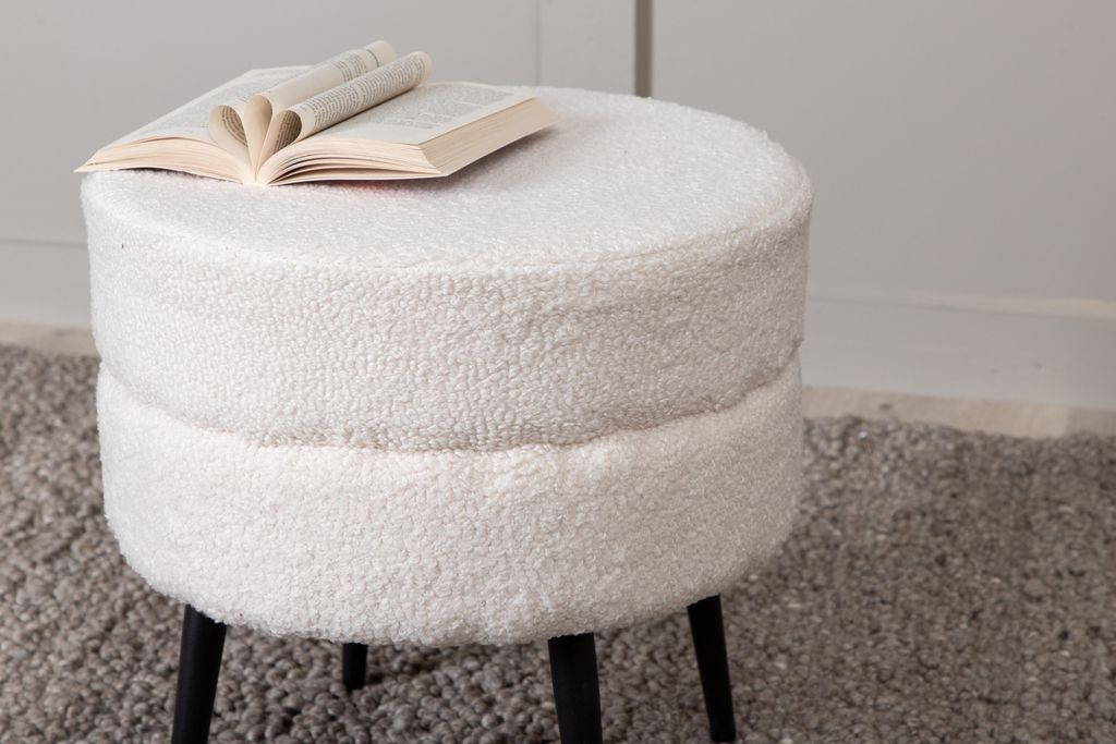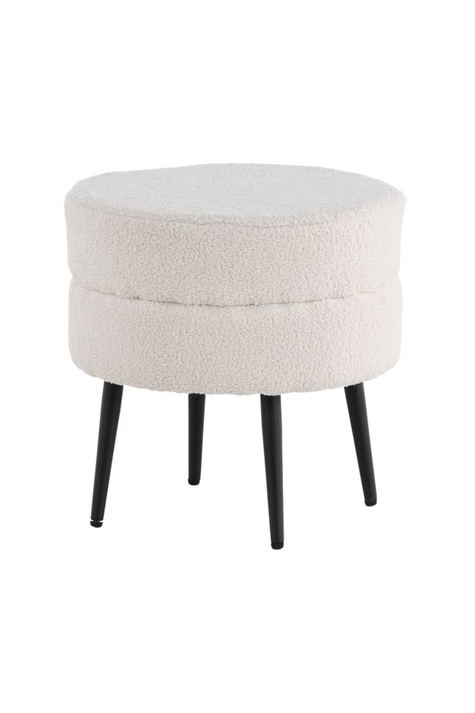 Trendig fotpall med modern teddytyg, benvit kulör och svart stålben. Praktisk och stilren för alla rum.