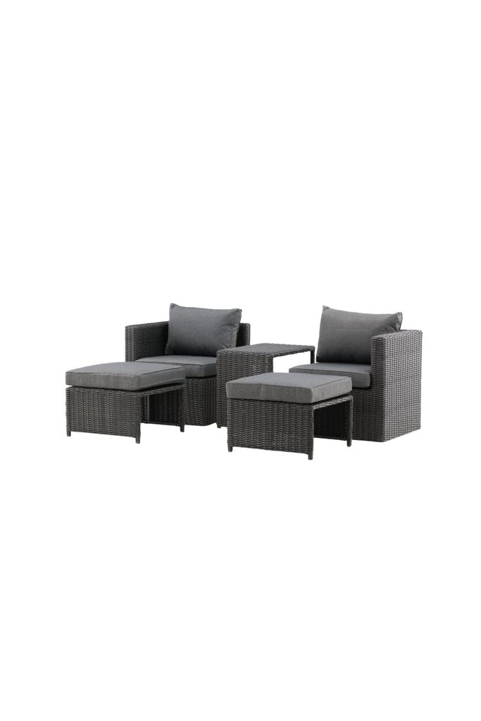 Njut av sommaren i stil med vår loungegrupp i svart konstrotting, komplett med fåtöljer, fotpallar och bord.