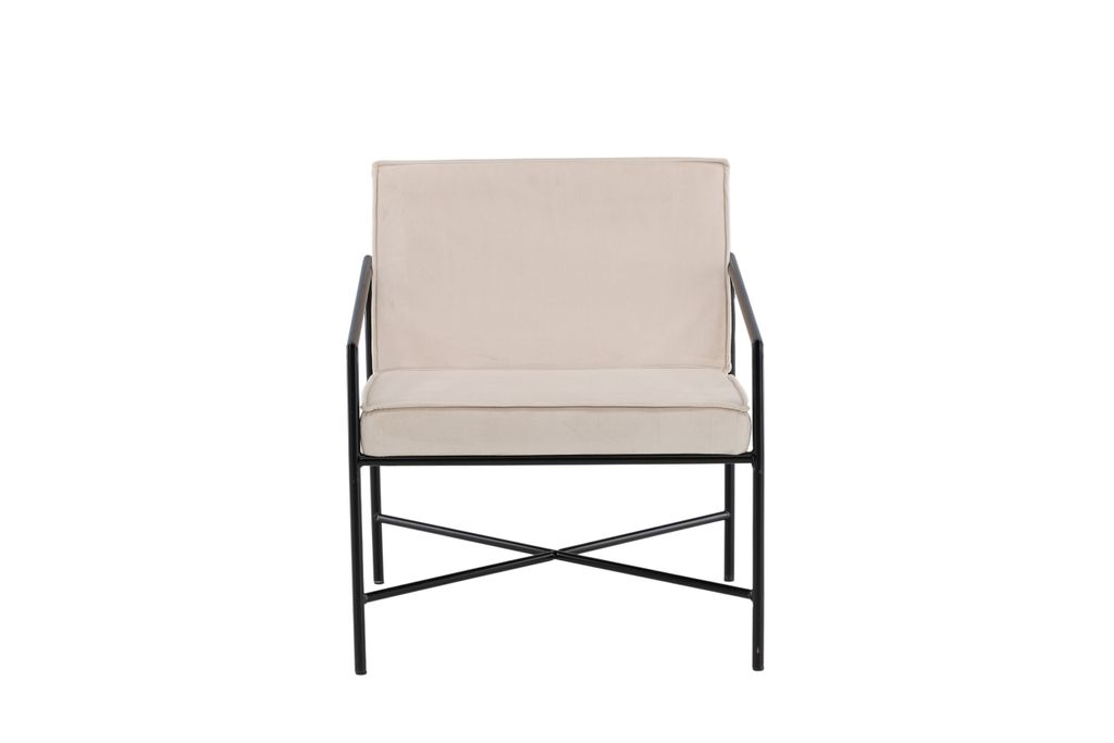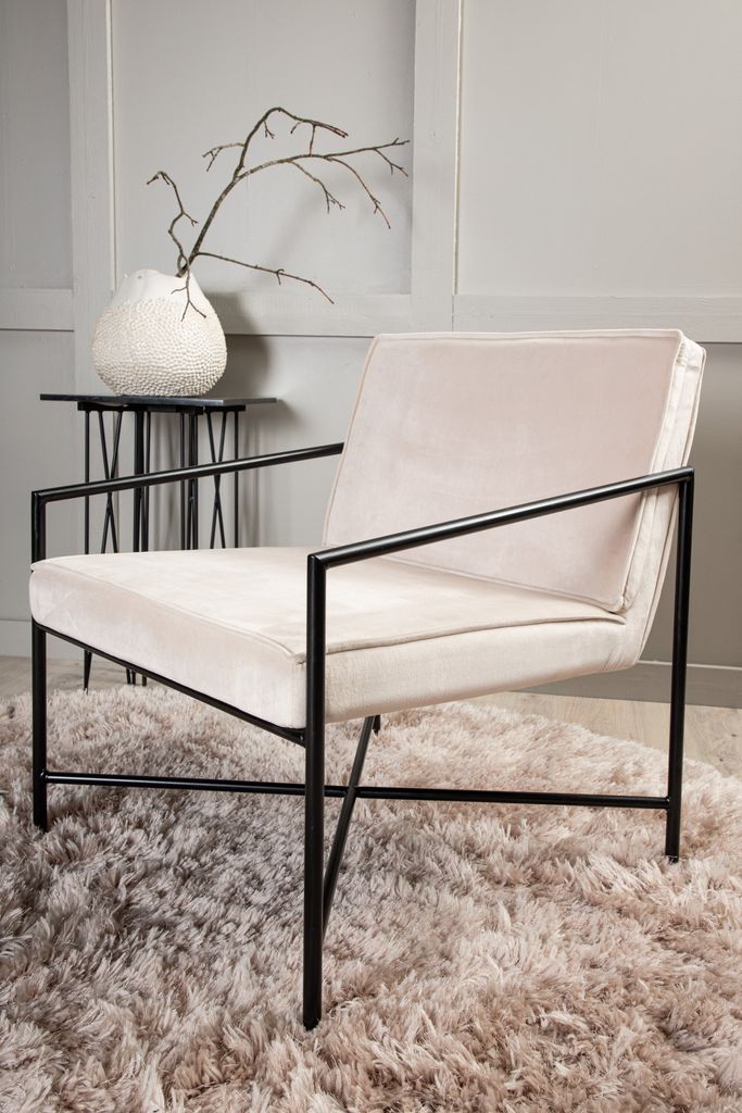 Omfamna skandinavisk minimalism med Rakel Fåtölj. Beige sammet och svart metall ger tidlös elegans och komfort.