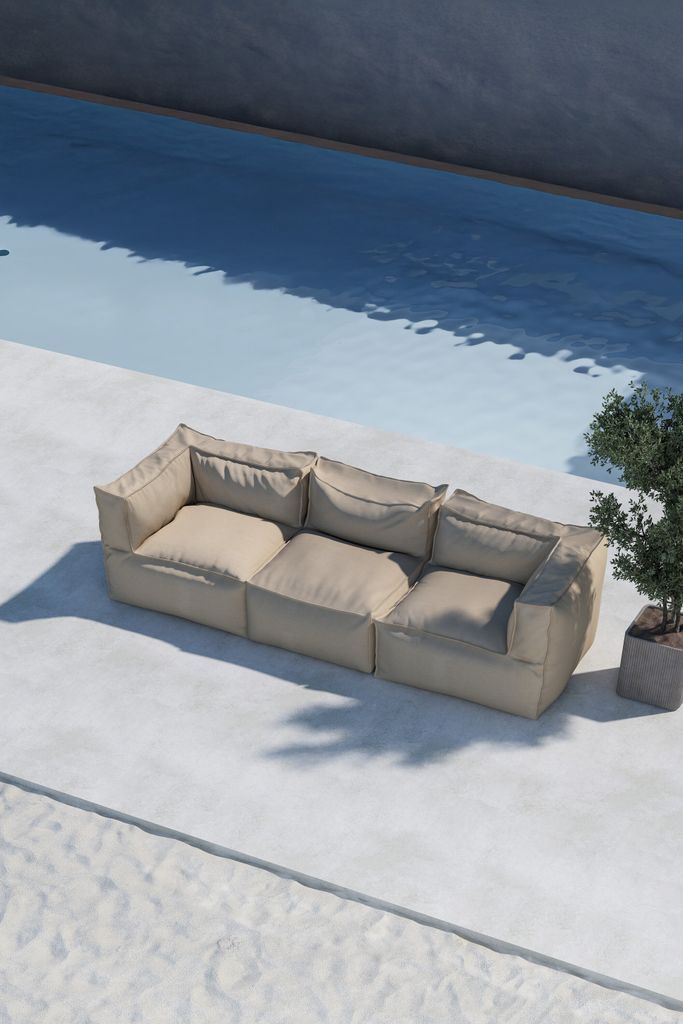 Soffan är klädd i slitstarkt beige Olefin-tyg, ett vädertåligt material som är både vattenavvisande och UV-resistent. Detta säkerställer att färg och kvalitet bibehålls över tid, även under skiftande väderförhållanden. De mjuka dynorna ger extra komfort och gör soffan till en perfekt plats för att njuta av långa, sköna stunder utomhus.