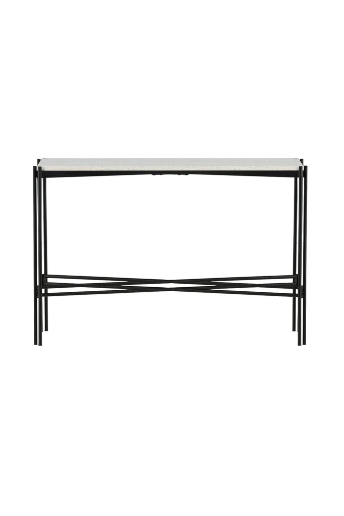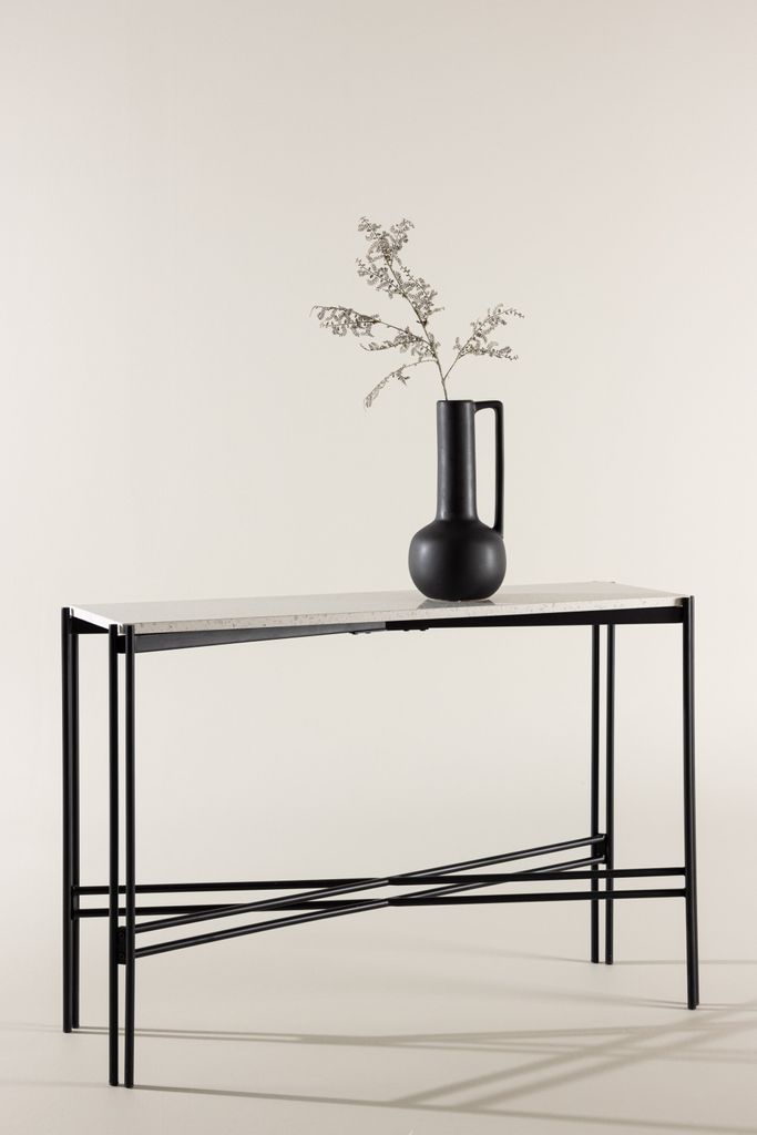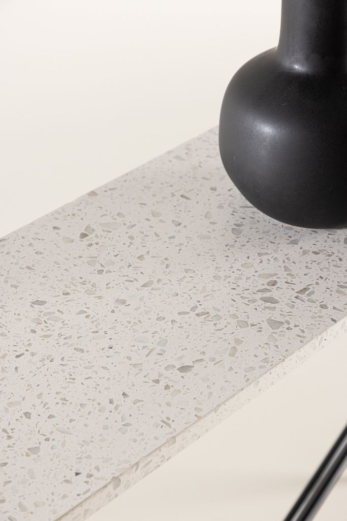 Modernt sidobord med vit terazzo-skiva och svart metallram, perfekt för stil och funktion.