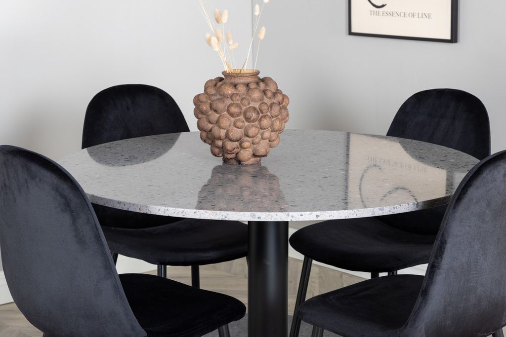 Razzia, ett runt matbord med marmorliknande uttryck, här tillsammans med svarta sammetsstolar i serien Polar. Här får du en matgrupp som direkt inger lyx och elegans.
