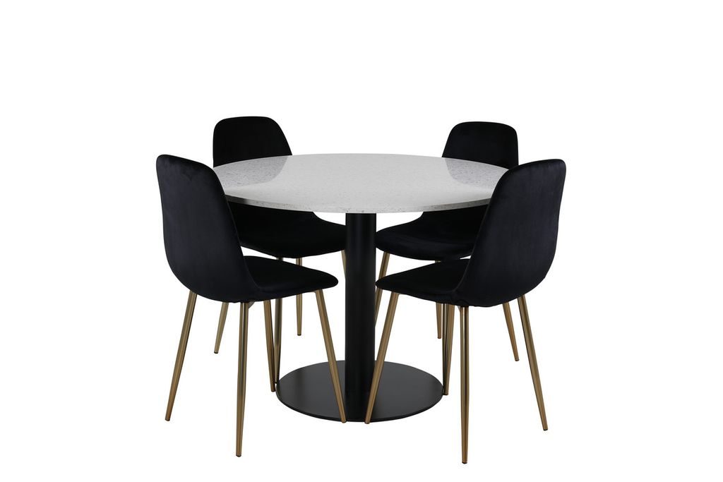 En elegant matgrupp som skapar en inbjudande atmosfär! Matbord Razzia har en rund bordsskiva i vacker terazzo med vit finish och en cylinderformad stomme i svart metall. Här tillsammans med moderna matstolar från serien Polar. Stolen har en helklädd design med ben i mässingfolierad metall, en lätt rundad rygg och sits i smäckert svart sammetstyg med mjuk stoppning för extra komfort. Med den här matgruppen slipper du kompromissa mellan bekvämlighet och design!