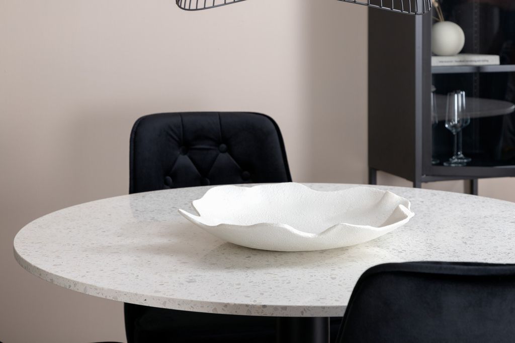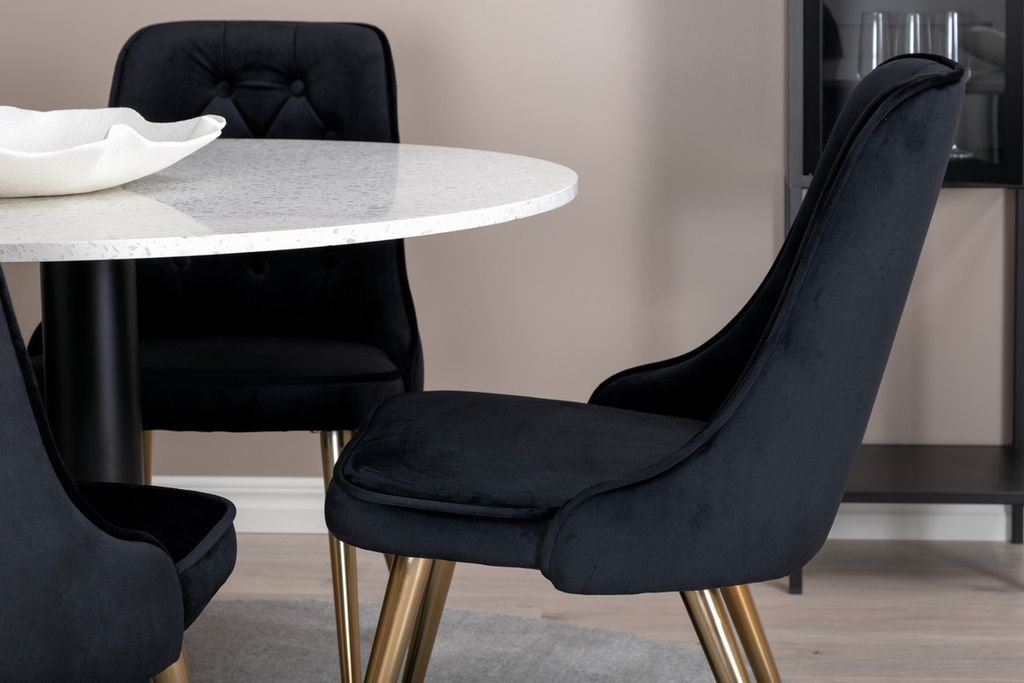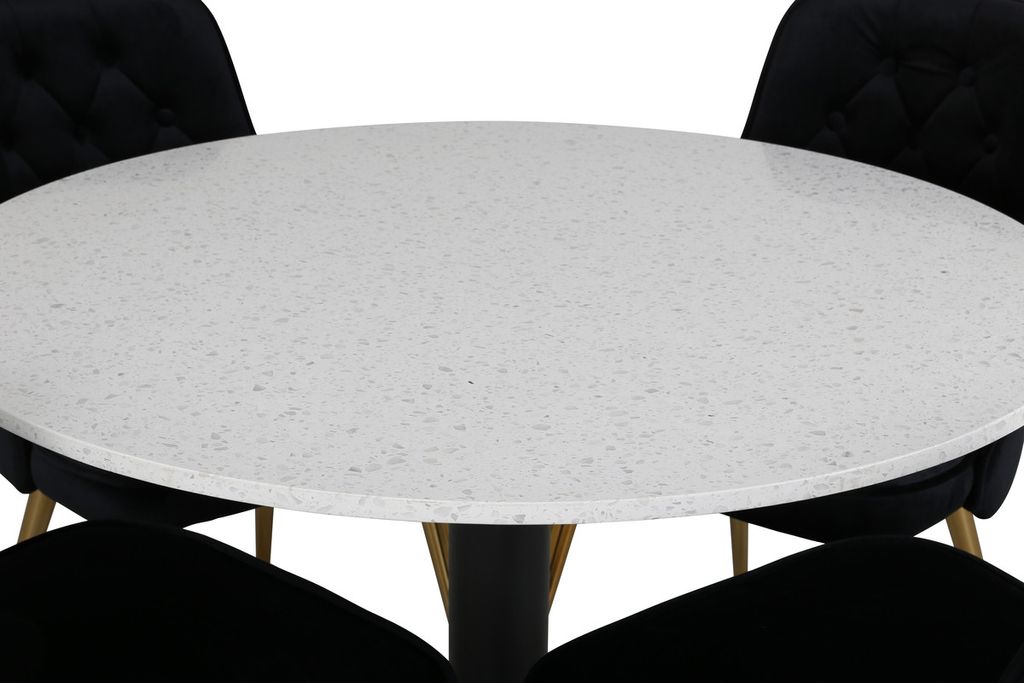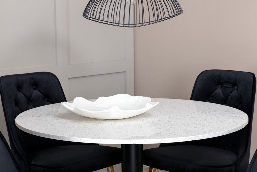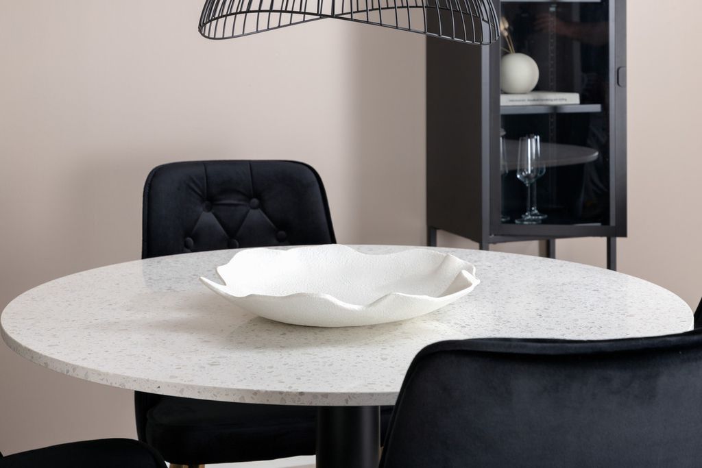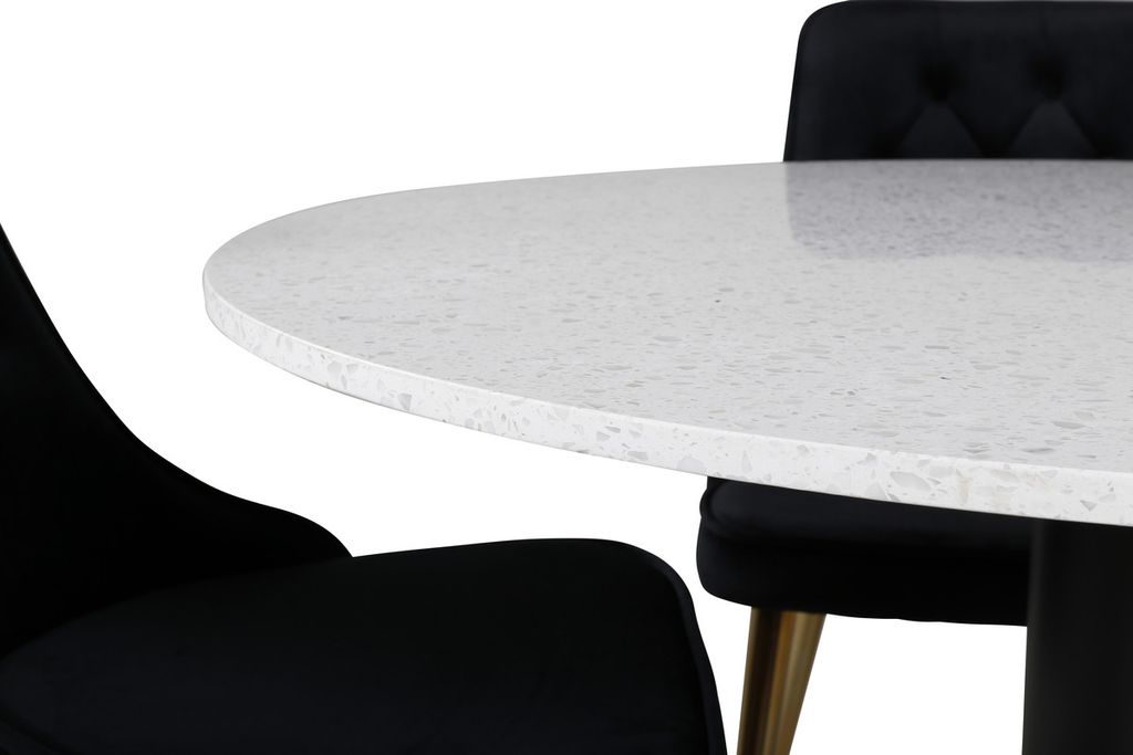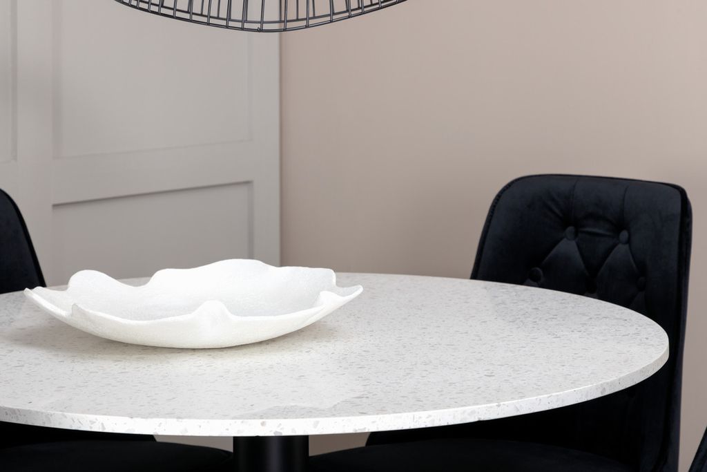 Elegant, pampig och bekväm matgrupp - vad mer kan man önska? Matbord Razzia har en rund bordsskiva i vacker terazzo med vit finish och en cylinderformad stomme i svart metall. Här tillsammans med tuffa matstolar från serien Velvet Deluxe. Stolen har en helklädd design, ben i mässingfolierad metall samt rundad rygg och sits i läckert svart sammetstyg med mjuk stoppning och dekorativa knappar. Här sitter du bekvämt länge!