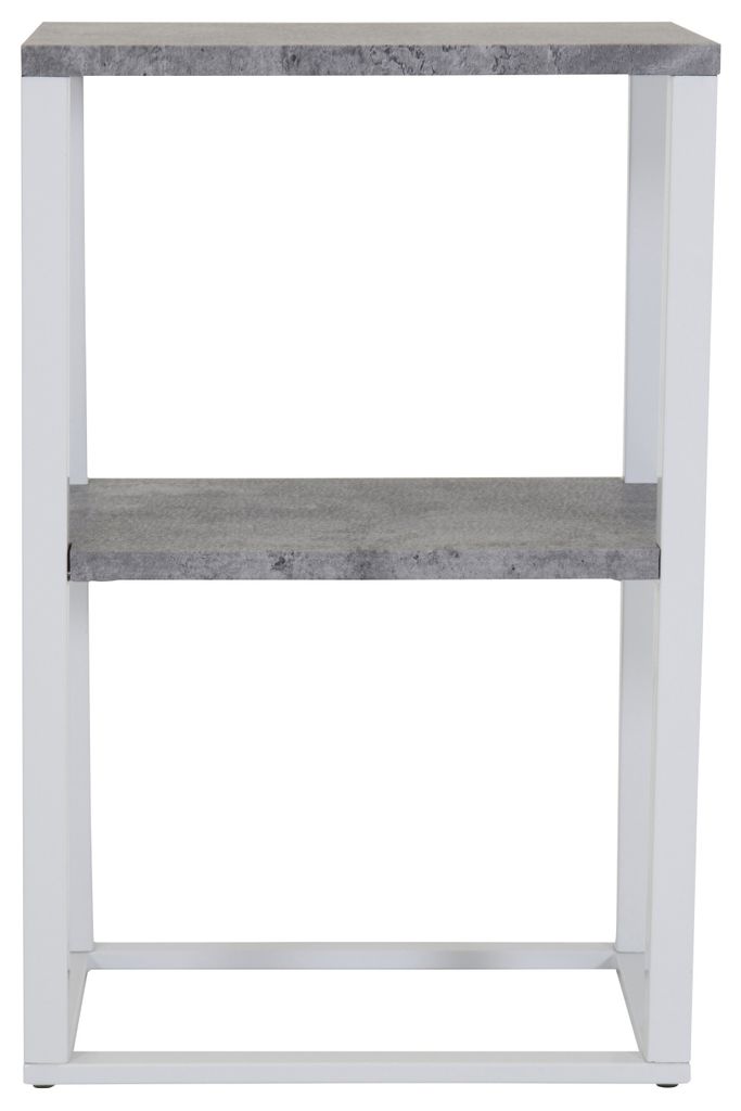 Den vita metallstommen ger en stabil struktur och kompletterar den grå ytan på ett förtjusande sätt. Bordets design gör det enkelt att integrera i olika inredningsstilar, oavsett om det används som ett nattduksbord i sovrummet eller ett praktiskt sidobord i vardagsrummet.
