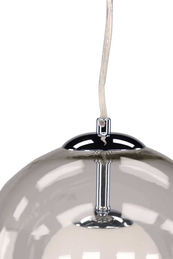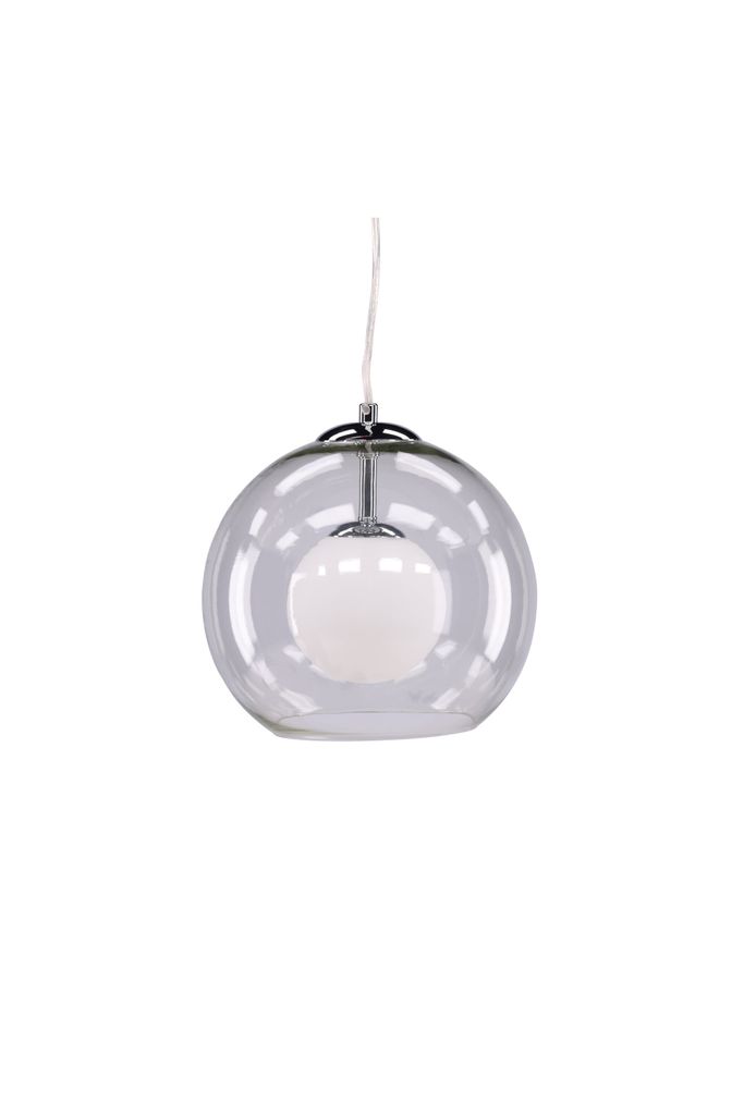 Bilderna visar hur den transparenta glaskupan elegant omsluter ljuskällan och ger en jämn belysning. Den är lika vacker över ett matbord som i ett vardagsrum eller sovrum. Lampans kromade detaljer ger den en modern känsla medan den vita insidan reflekterar ljuset på ett effektivt sätt.