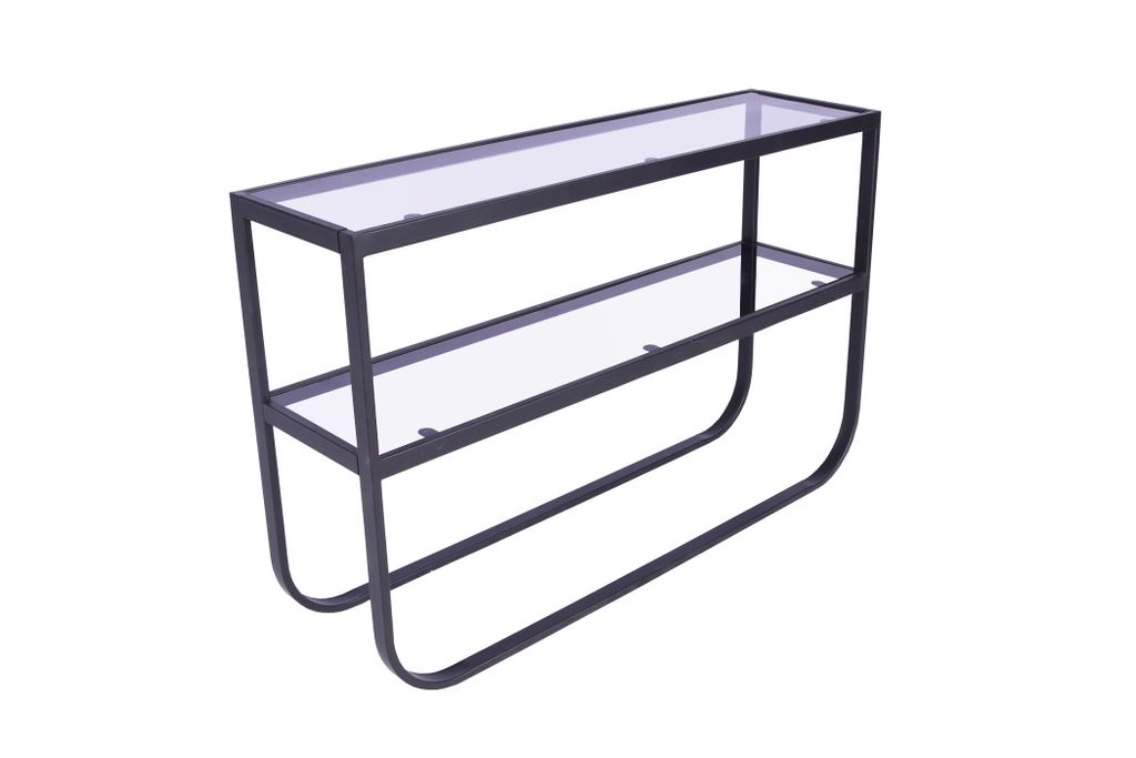 Den svarta ramen, tillverkad i robust stål, ger bordet en stabil och industriell känsla som passar perfekt in i moderna hem. De två hyllplanen av mörkt glas ger en elegant och sofistikerad touch, vilket gör bordet till ett iögonfallande inslag i din inredning.
