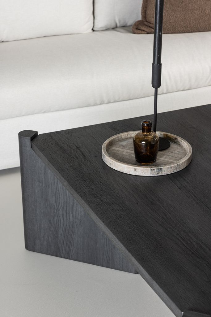 Detta soffbord har en elegant svart färg och är tillverkat av högkvalitativt MDF-material, vilket säkerställer både stabilitet och långvarig hållbarhet. Den unika designen, med sina distinkta vinklade ben, ger en modern och iögonfallande stil som passar perfekt i ett skandinaviskt inspirerat hem.