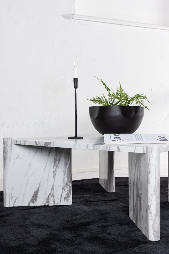 Den generösa ytan på bordet ger möjlighet att visa upp dekorationer eller hålla böcker och tidningar inom räckhåll. Den enkla men ändå iögonfallande designen passar utmärkt i minimalistiska inredningar, medan den marmorliknande ytan ger ett djärvt och elegant intryck.