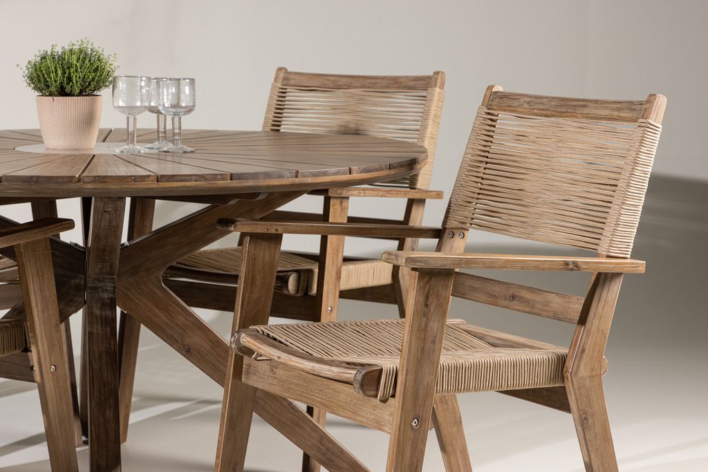 Rosario bordet är själva centrumet i denna ensemble med sin imponerande konstruktion i brunt akaciaträ och en generös diameter på 140 cm. Det är en perfekt plats för trevliga samkväm utomhus med vänner och familj.