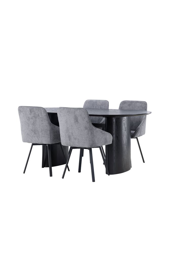 Modern matgrupp med svart oval bordsskiva och grå stoppade stolar för stil och komfort.