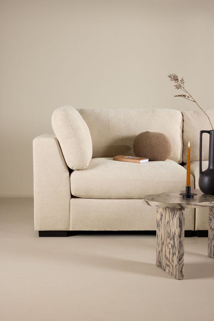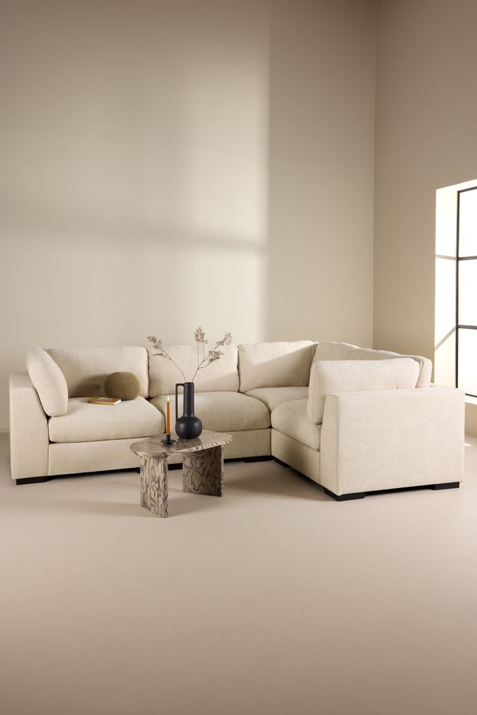 Salerno hörnsoffa från Venture Home är en perfekt kombination av modern design och funktionalitet, vilket gör den till en idealisk mittpunkt i ditt vardagsrum. Soffan är klädd i mjuk beige polyester som ger en behaglig sittupplevelse och är lätt att underhålla. De kontrasterande svarta benen ger ett elegant och luftigt uttryck, samtidigt som de bidrar till en stabil konstruktion.