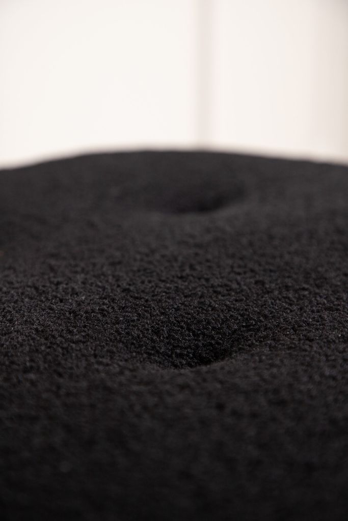 En elegant sittpuff i sotigt svart fleecetyg med träfärgade ben, perfekt för ett stilrent hem.