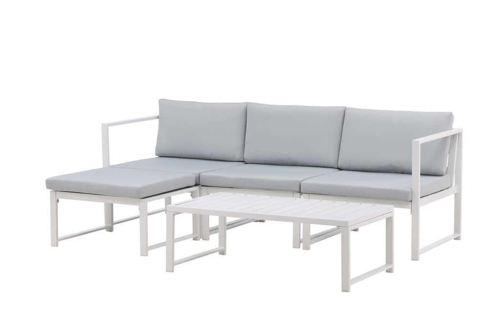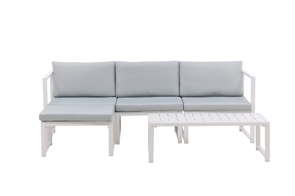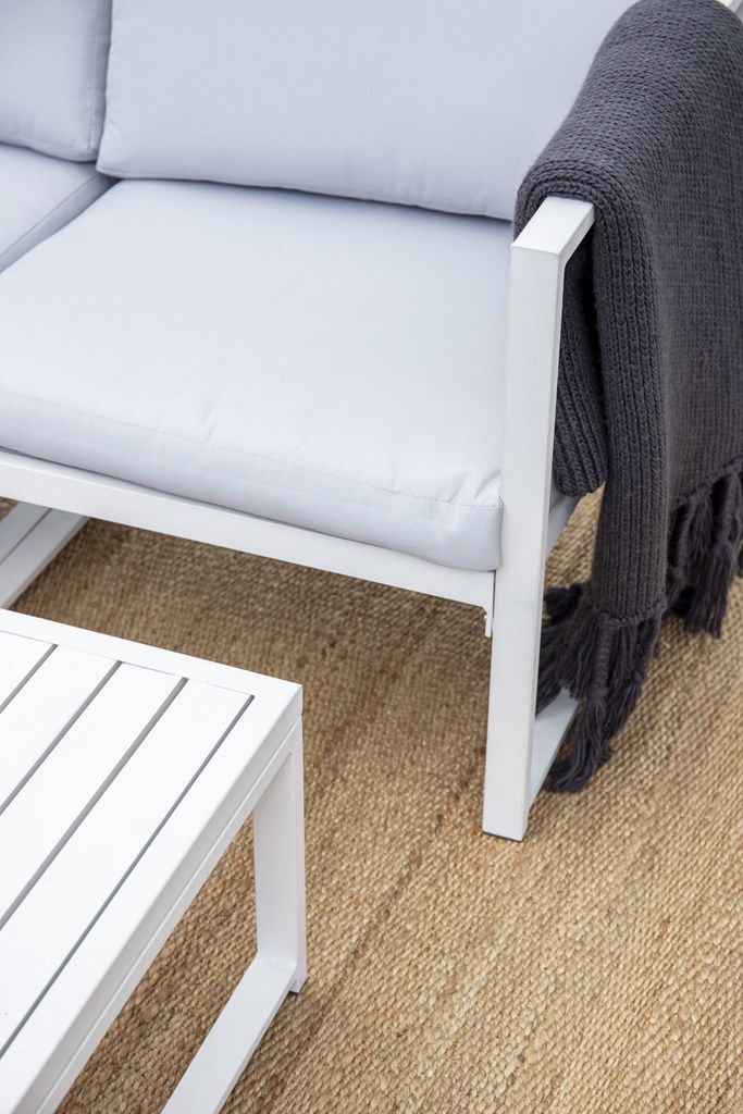 Material & Design: Soffgruppen består av en tresits soffa med en praktisk divandel och ett matchande soffbord. De är tillverkade i vit pulverlackerad metall och aluminium, vilket inte bara gör dem tåliga för utomhusbruk utan också enkla att underhålla. Den robusta konstruktionen säkerställer hög hållbarhet och stabilitet.
