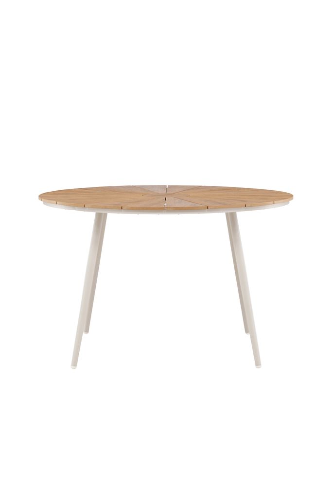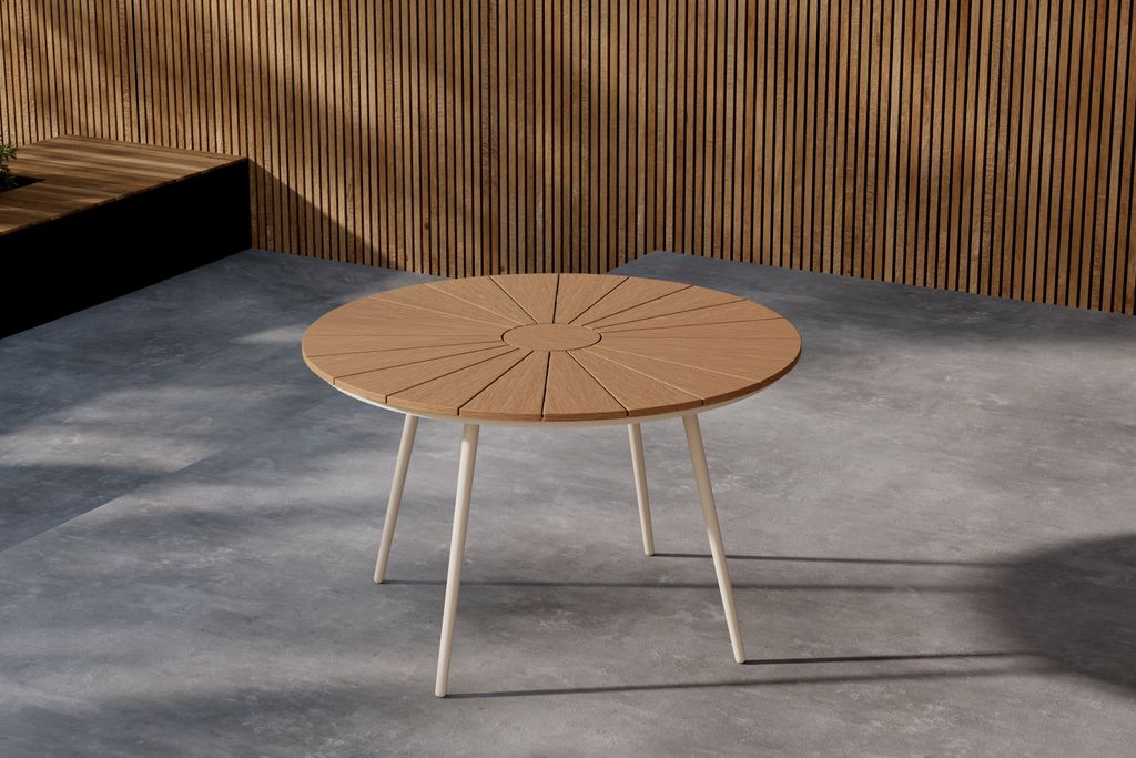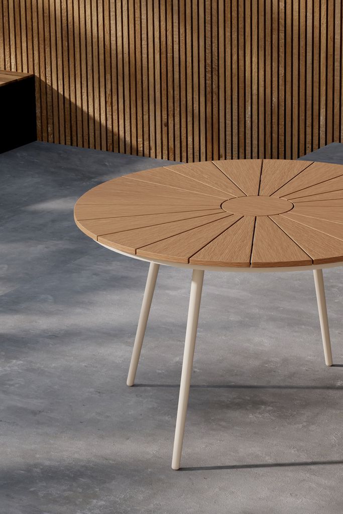 Stilrent runt matbord i beige aluminium och polywood, perfekt för utomhusmiddagar.