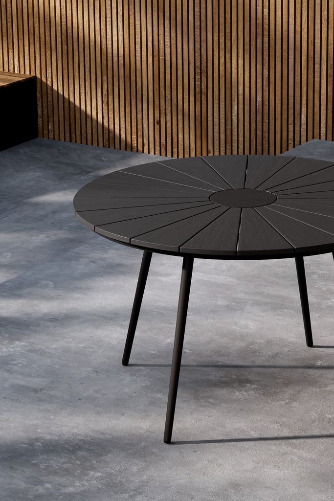 Den djupa svarta färgen ger bordet ett stilrent utseende som smälter in i alla utomhusmiljöer. Bordets design framhävs av de slanka benen som bidrar till en modern estetik, samtidigt som de säkerställer stabilitet.
