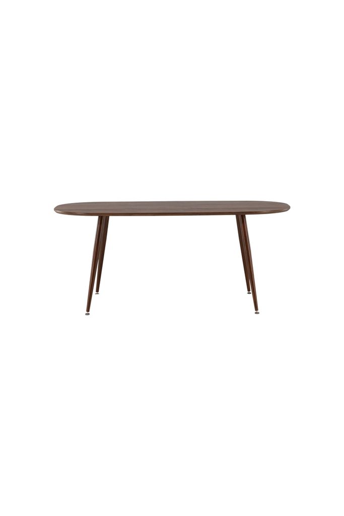 Sanford matbord i skandinavisk design med en tunn, oval mörkbrun bordsskiva och eleganta metallben.