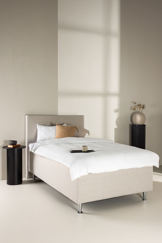 Den neutrala beiga färgen tillför en touch av elegans och harmoni till ditt sovrum, medan den stilrena sänggaveln ger sängen karaktär och blir ett blickfång. De stadiga plastbenen ger stabilitet och en modern känsla till ditt hem.