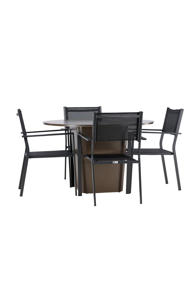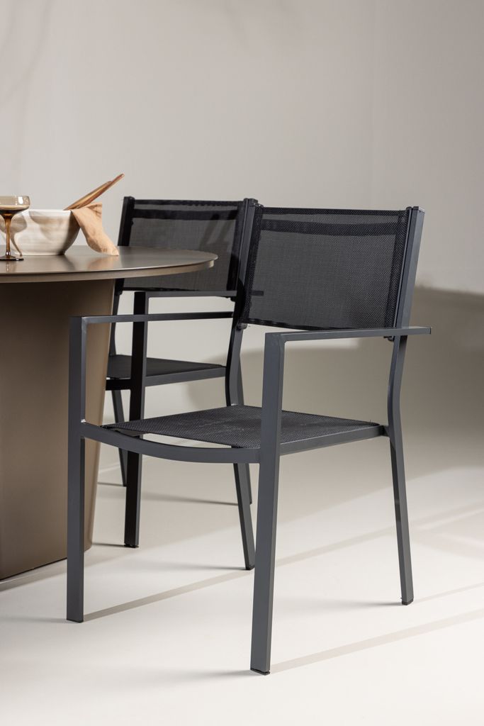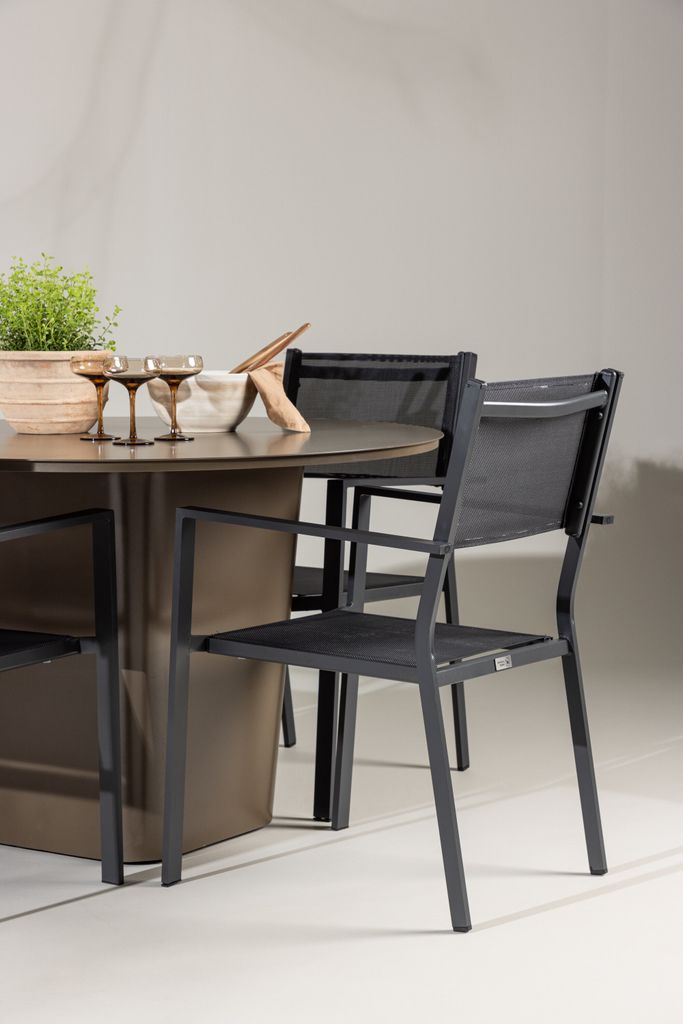 De medföljande Copacabana-stolarna erbjuder en bekväm sittupplevelse med sin ergonomiska design. Tillverkade av lättskött aluminium i en smakfull svart nyans, kompletterar de bordet perfekt och skapar en inbjudande atmosfär.