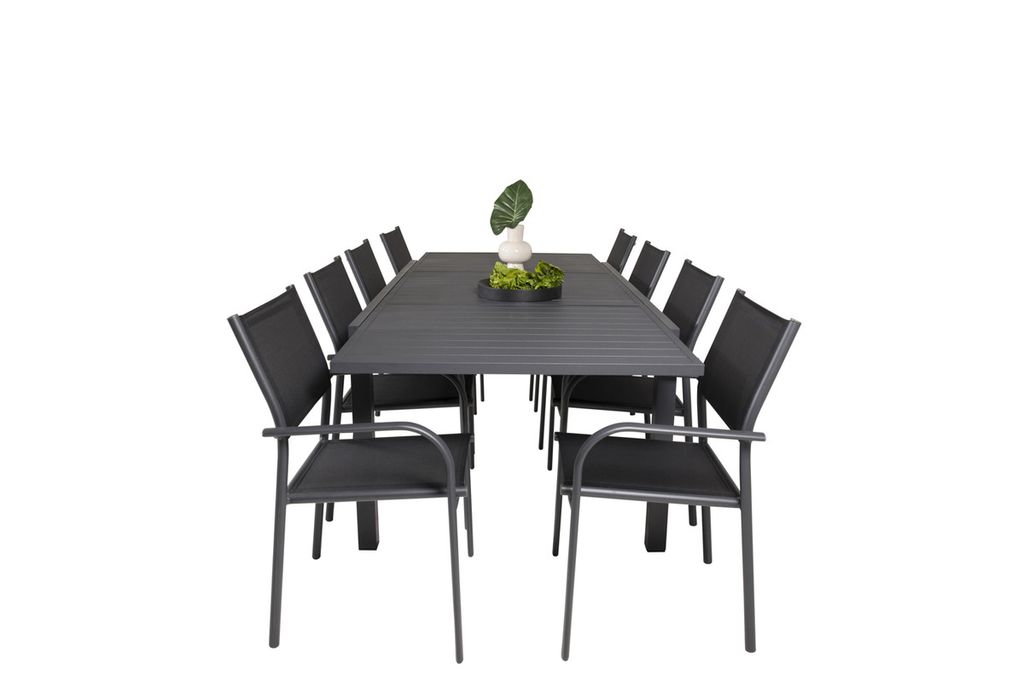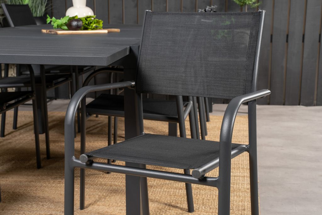 En matgrupp genomgående i svart. Här kombineras vårt förlängningsbara matbord Marbella med våra moderna matstolar Santorini. Längta till utesäsongen med oss!