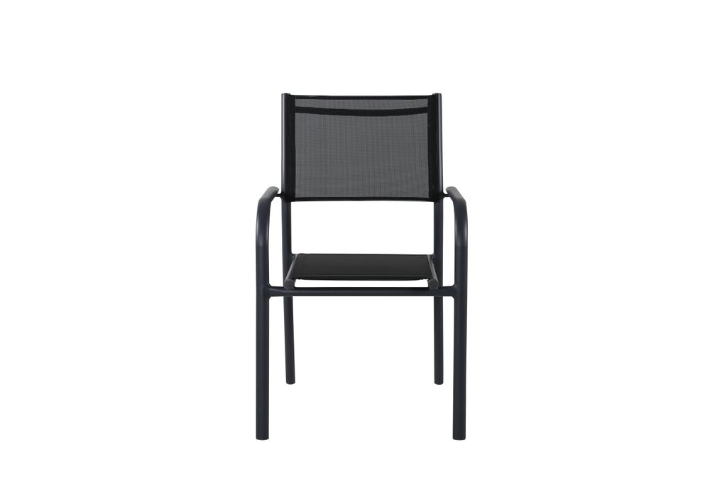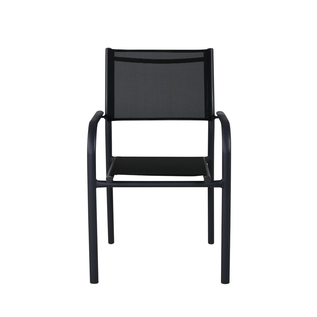 Elegant och praktisk matstol i svart aluminium och textilene, perfekt för uteplatsen. Stapelbar och lättskött.