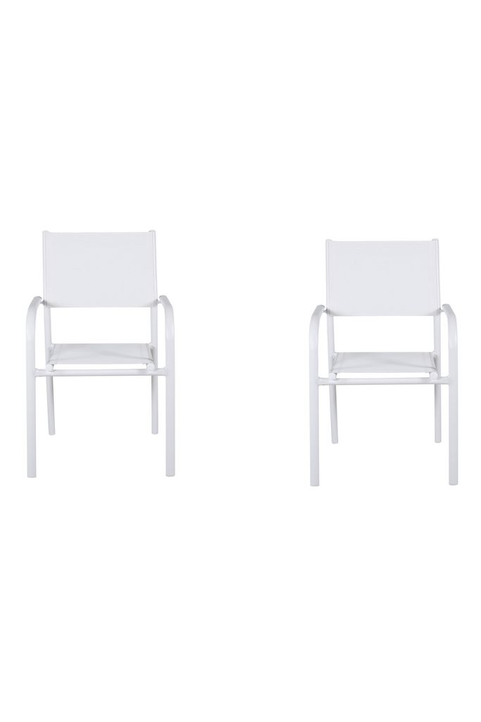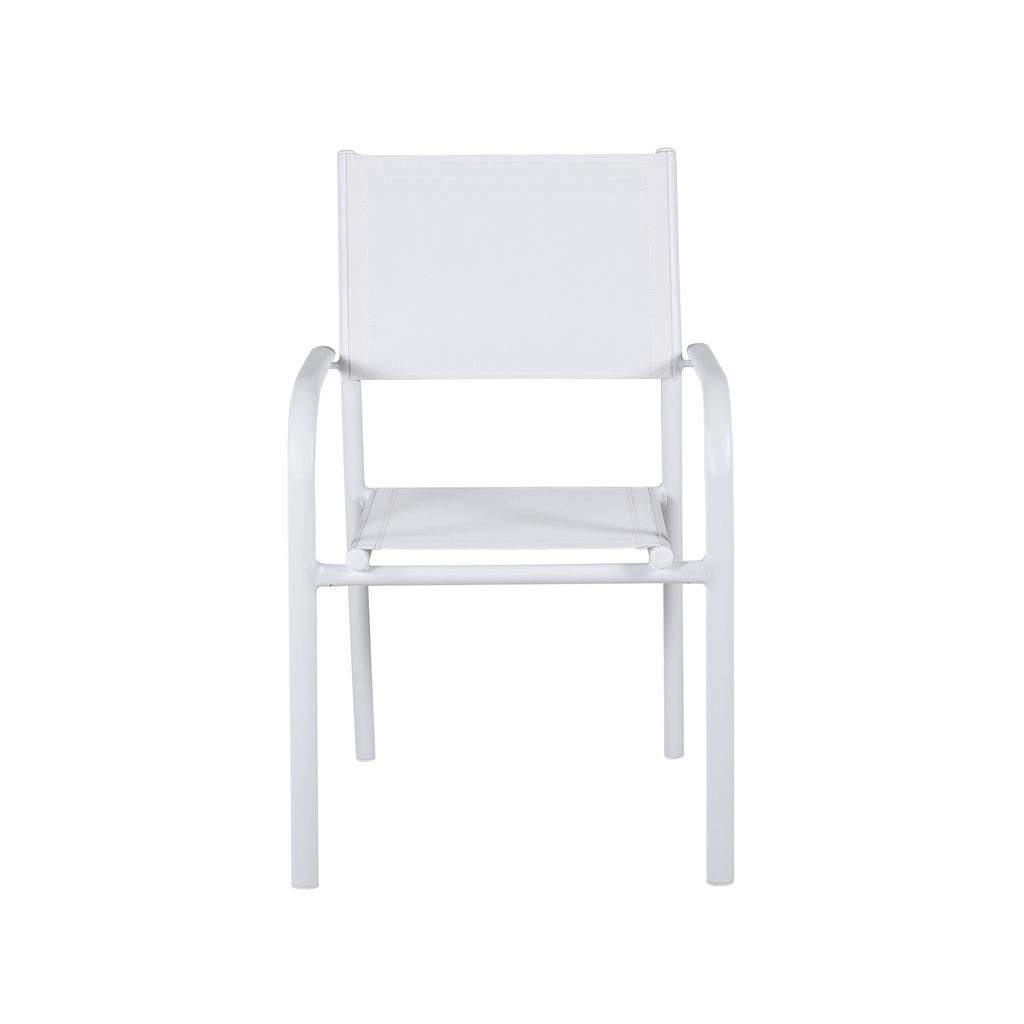 Stilrena och stapelbara matstolar i vit aluminium och textilene, perfekta för uteplatsen.