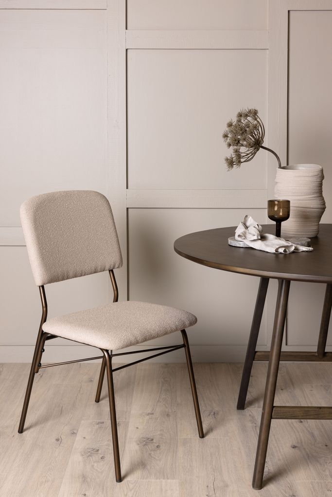 Stilren och bekväm matstol i beige polyestertyg med mörkbruna stålben. Perfekt för trendiga hem.