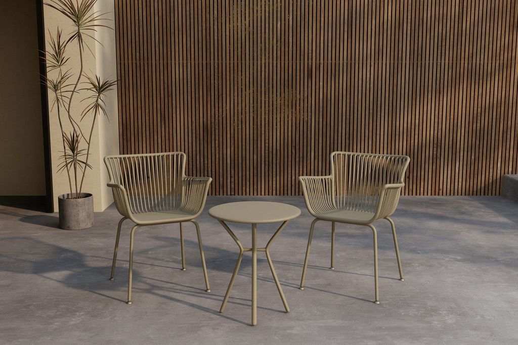 Skapa en inbjudande plats för morgonkaffet eller en avkopplande stund i solen med Sifnos cafésätt i varm och mjuk beige ton. Setet består av två bekväma stolar med omfamnande design och ett runt bord med stilrena linjer – perfekt för balkongen, terrassen eller trädgården.