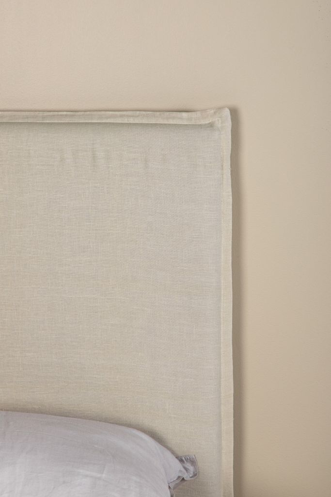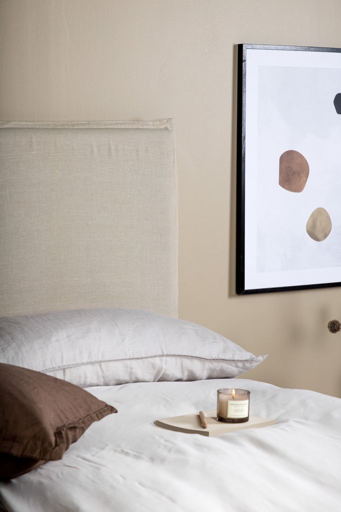 Elegant sänggavelsskydd i beige linne för en harmonisk och stilren look.