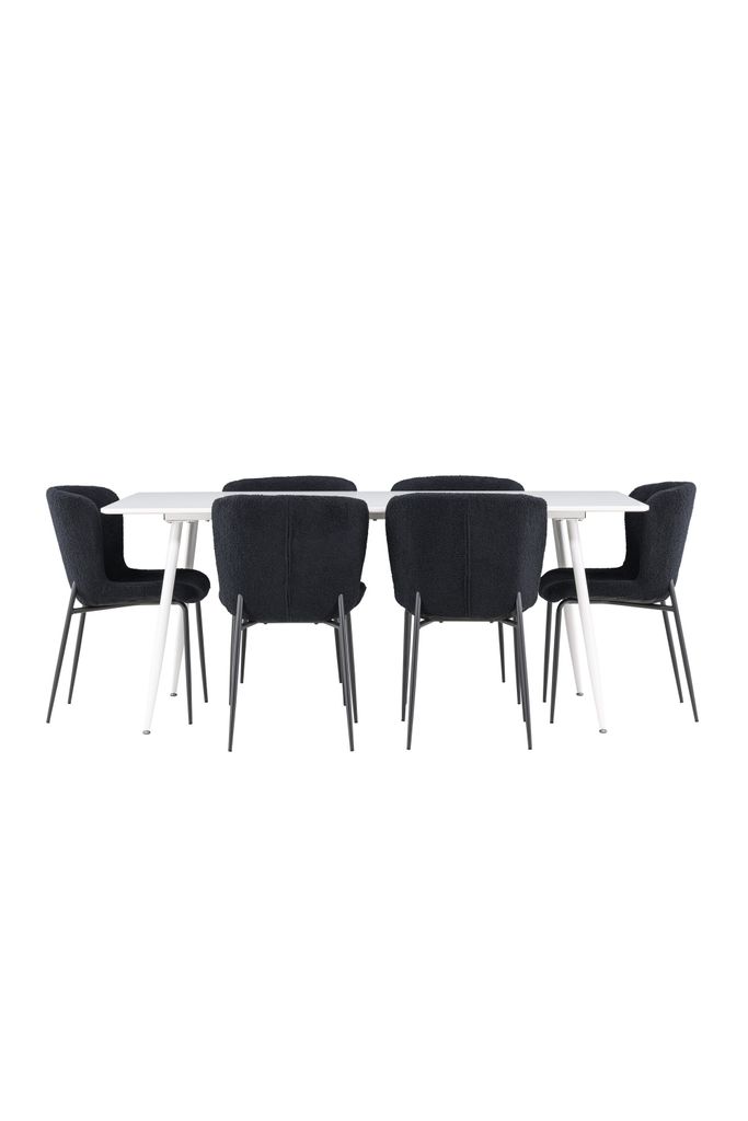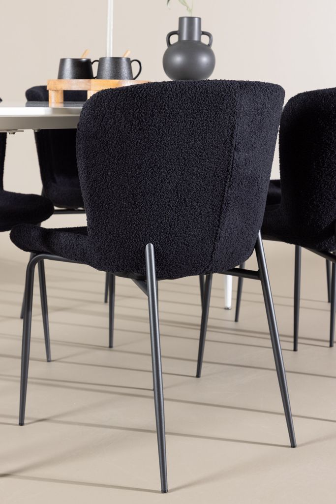 Matbordet Silar har en rymlig vit bordsyta som mäter 180x90 cm, vilket ger en ljus och luftig känsla. Bordet har en stilren och modern design som passar perfekt i varje hem. Modesto matstolarna har en sits klädd i mjukt teddymaterial och eleganta svarta ben i stål, vilket ger en tidlös och sofistikerad look.
