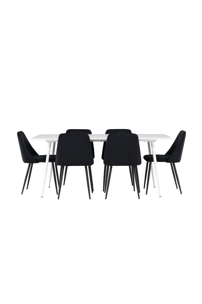 Elegant matgrupp med svart sammetstyg och vitt bord. Perfekt för stilfulla, inbjudande måltider.