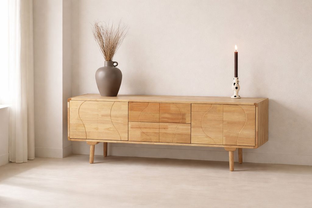 Möt Skärhamn, ett 180cm långt skåp som kombinerar funktion med detaljer. Tillverkat i vackert gummiträ med en naturlig finish, bjuder Skärhamn på ett varmt och organiskt uttryck som smälter in i både moderna och klassiska hem.