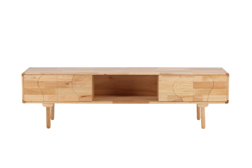 Den långa, eleganta siluetten vilar på fyra rundade ben som lyfter möbeln och ger ett luftigt intryck - perfekt för dig som vill skapa rymd och lätthet i rummet. I mitten av skåpet finns ett öppet hyllplan, idealiskt för böcker, dekorationer eller teknik.