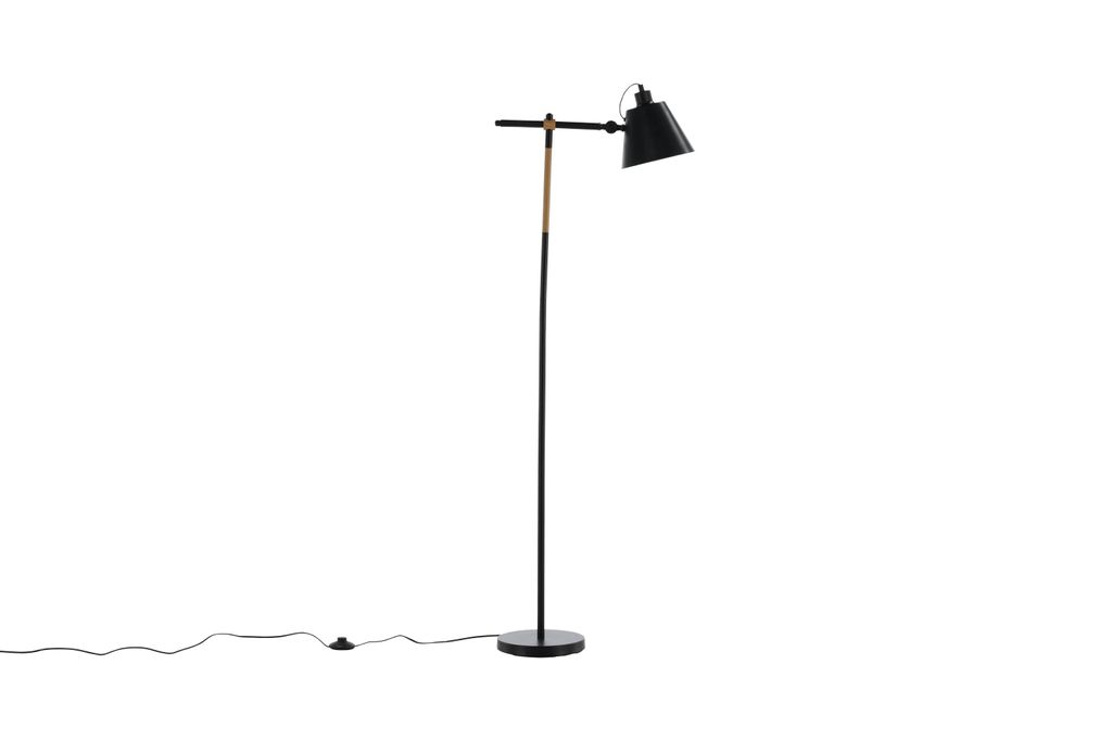 Lampans skärm är justerbar och kan vinklas upp eller ner, vilket gör den idealisk både som en läslampa och som en dekorativ belysning. Den klassiska kombinationen av svart och naturträ ger ett tidlöst utseende.