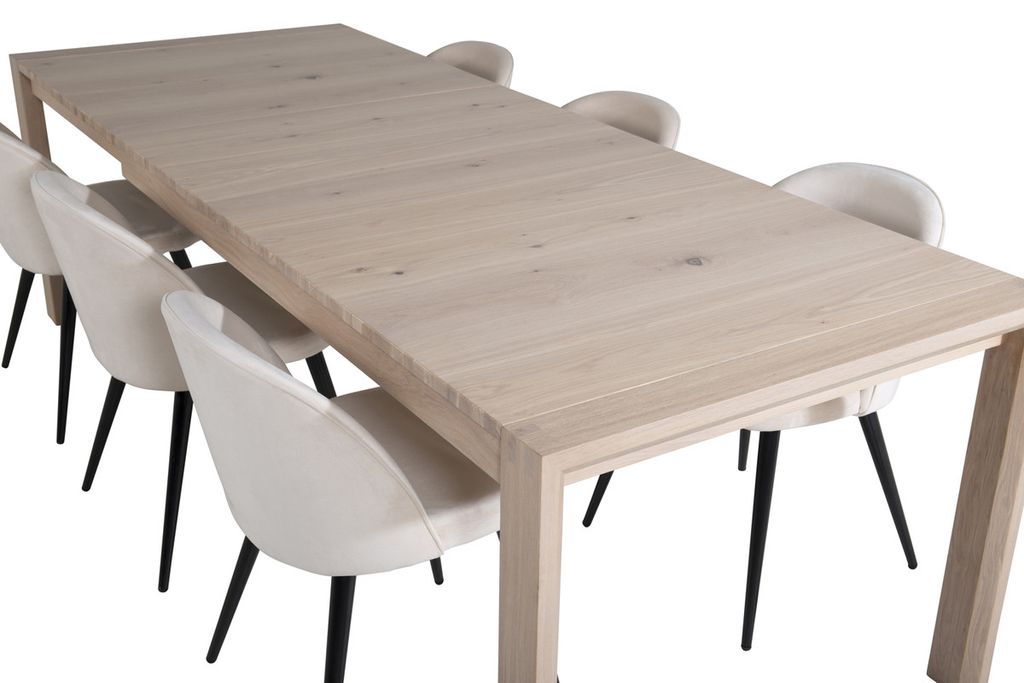Skapa ljus i rummet! Kombinationen av det förlängningsbara matbordet Slider och de bekväma matstolarna Velvet ger en varm, naturlig och ombonad känsla i vilket rum som helst!