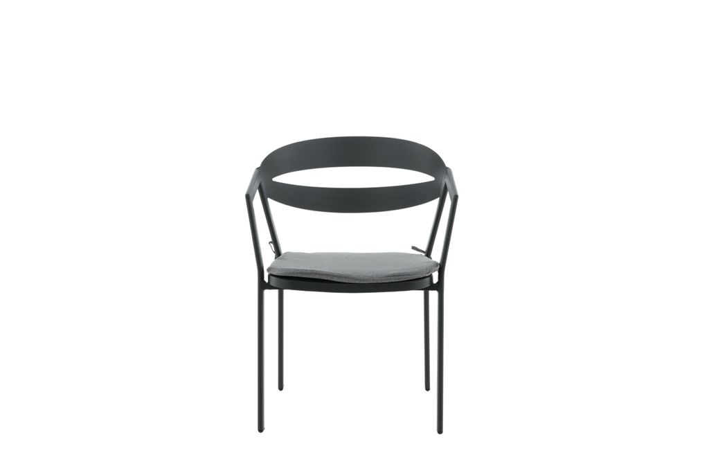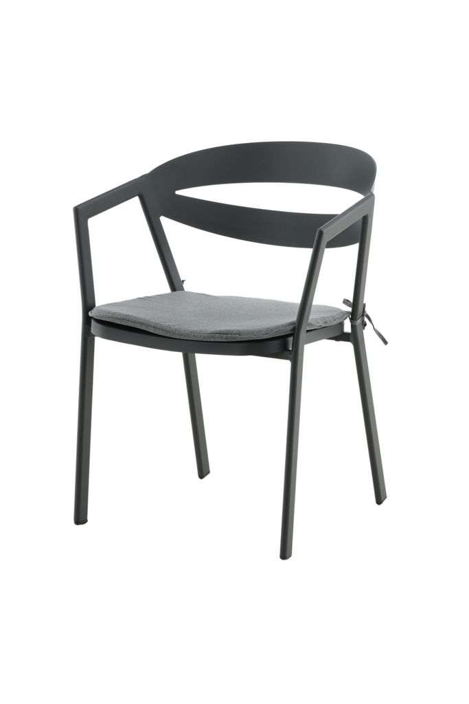 Elegant matstol i svart aluminium med armstöd. Perfekt för uteplatsen. Stapelbar och lättskött.