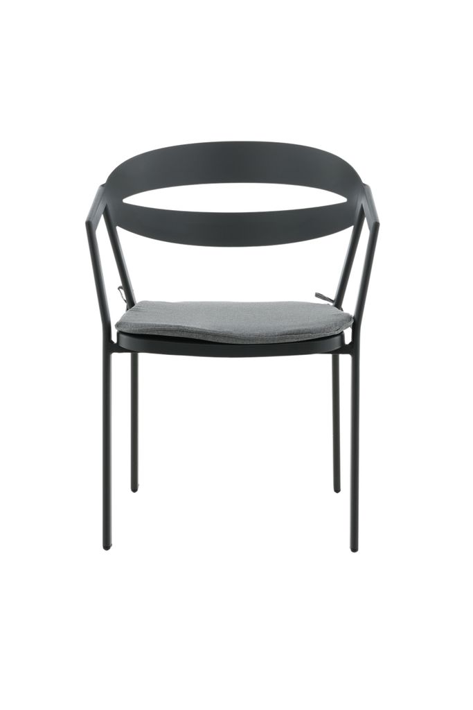 Tillverkad i slitstarkt svart pulverlackerat aluminium, är stolen både väderbeständig och lätt att underhålla. Den är utrustad med en bekväm grå dyna som enkelt kan rengöras, vilket gör den perfekt för långvarigt bruk utomhus.