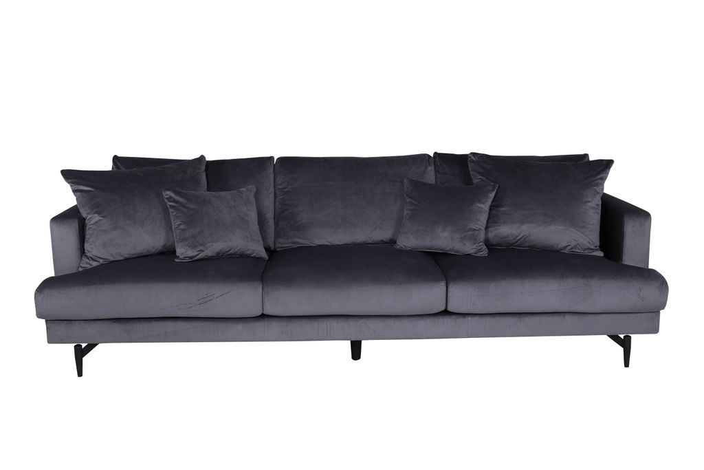 Mörkgrå sammetssoffa som kombinerar nordisk elegans med komfort. Smala metallben för enkel rengöring.