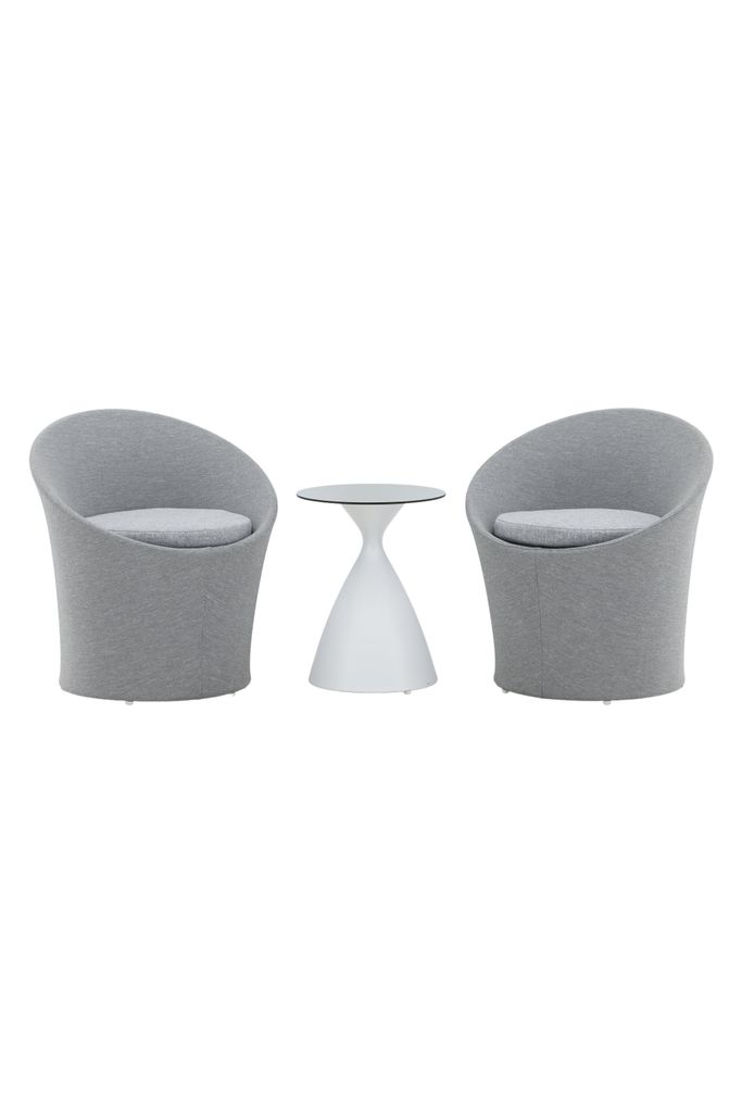 Elegant loungeset i vitt och grått med två bekväma stolar och ett lätt bord. Perfekt för både stora terrasser och små uteplatser.