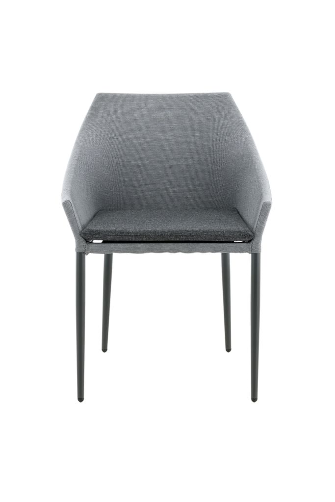 Elegant grå matstol med svarta ben, perfekt för altanen. Tidlös design och bekväma dynor.