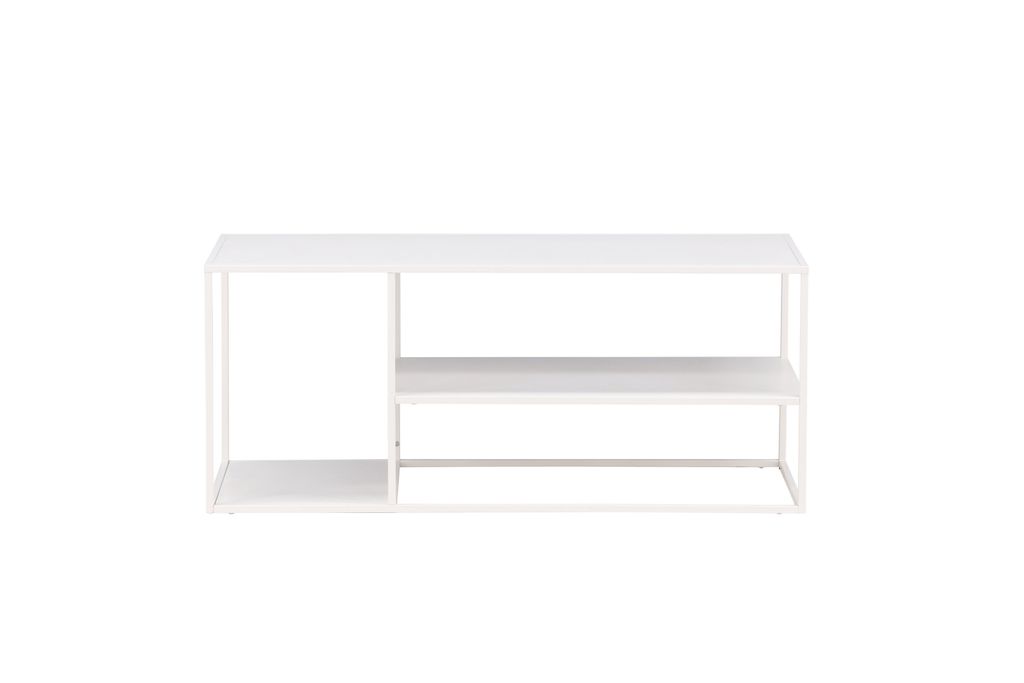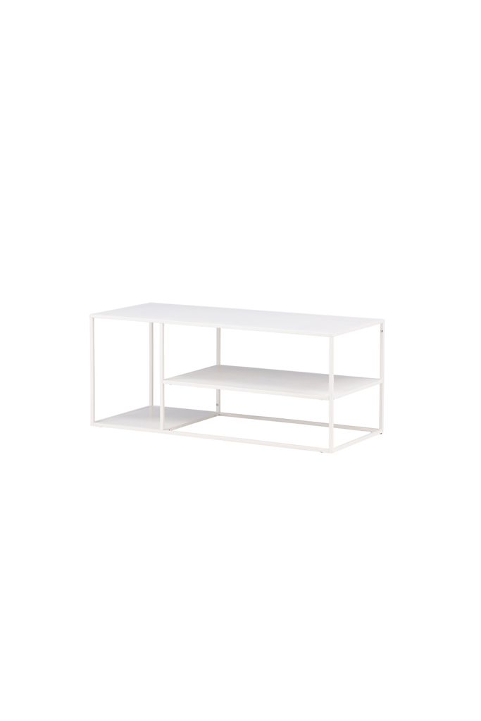 Stilrent bord i vit pulverlackerad stål med tre avlastningsytor, perfekt för modern inredning.