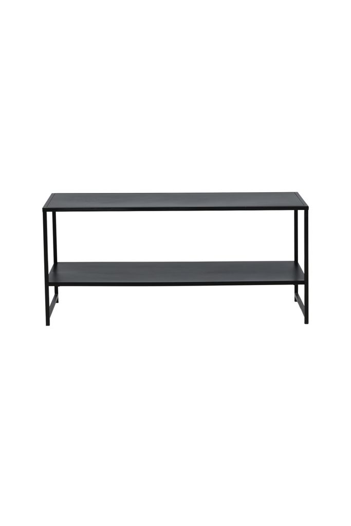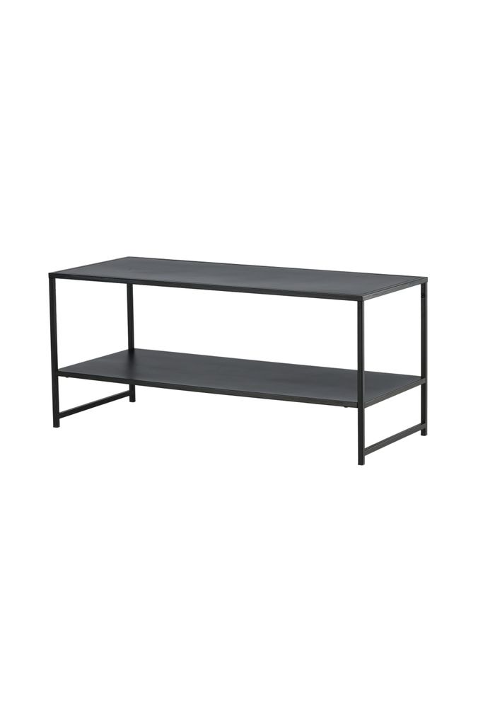 Elegant soffbord i svart stål med minimalistisk design och praktiskt hyllplan. Perfekt för moderna hem.