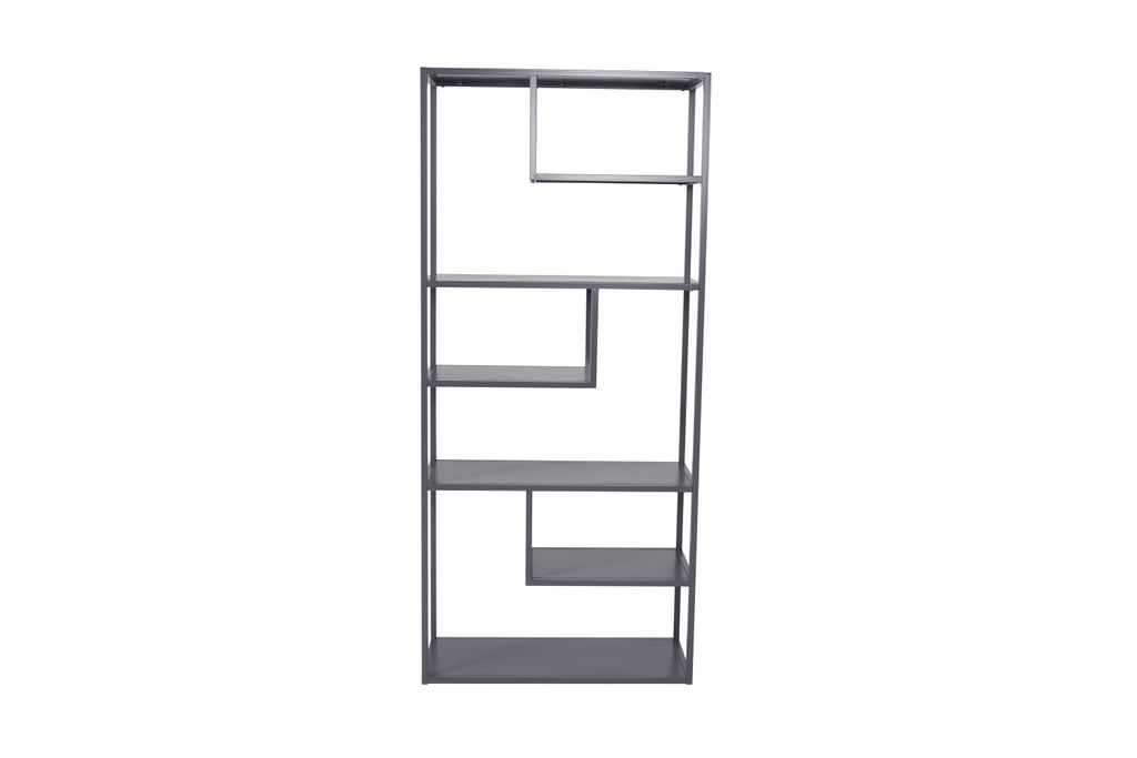 Modern förvaringslösning i ljusgrå pulverlackerad stål med flera avlastningsytor i olika höjder. Perfekt för stilmedvetna hem.