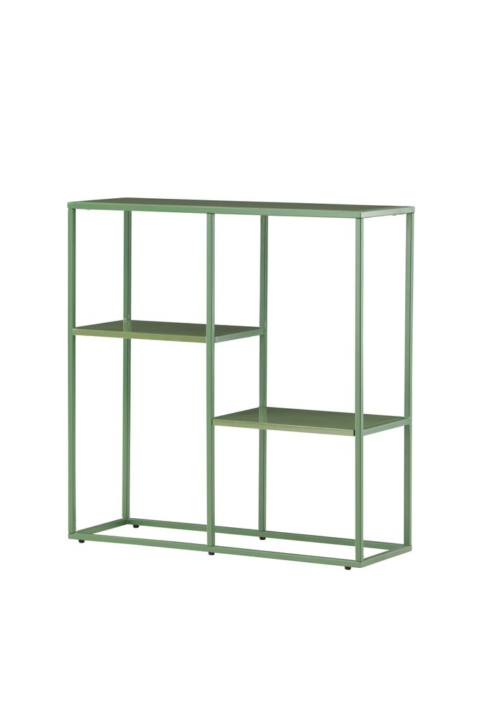 Grön hylla i stål med dynamisk design och flexibel förvaring, perfekt för modern och eklektisk inredning.
