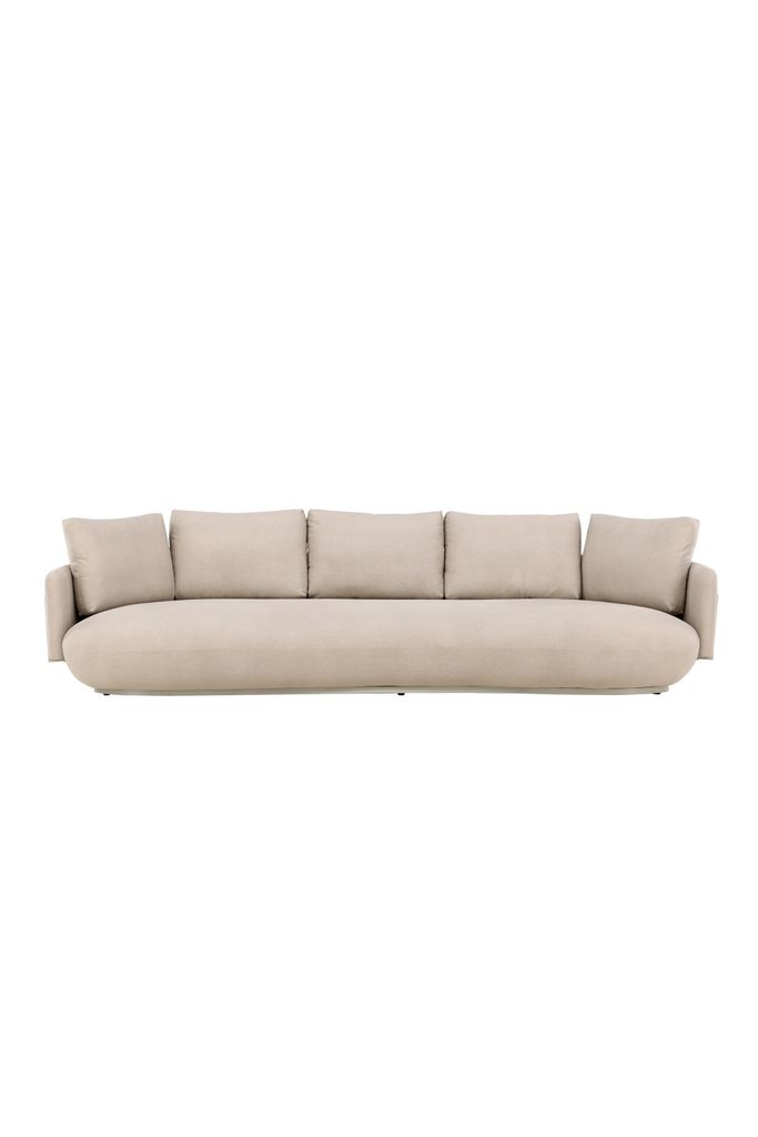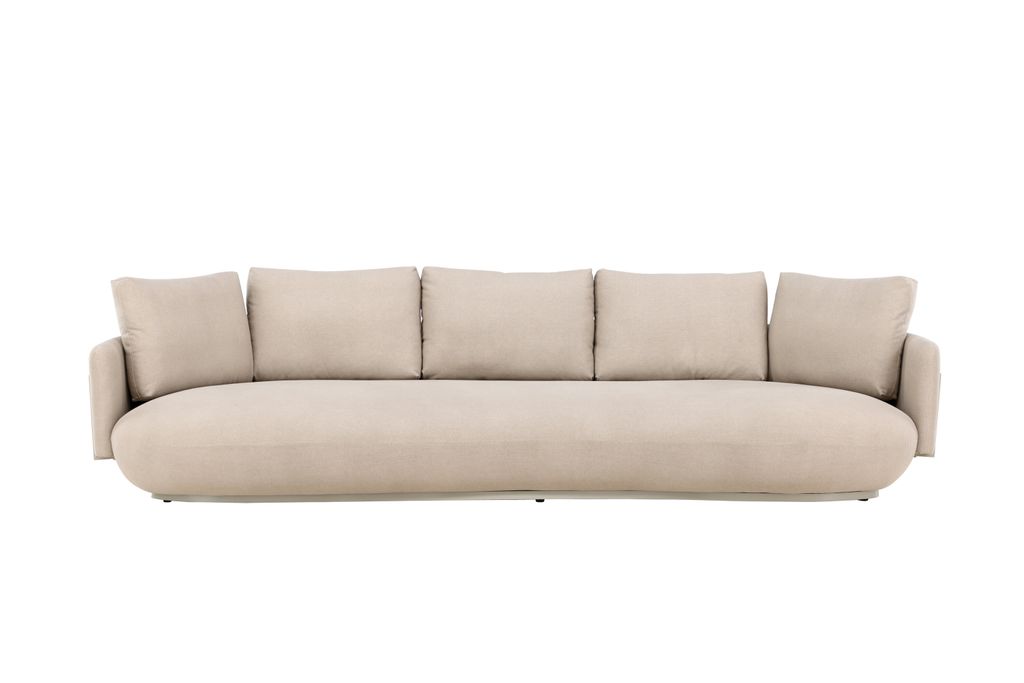 Elegant och modern 4-sitssoffa i beige med rundade former och medföljande kuddar för maximal komfort.