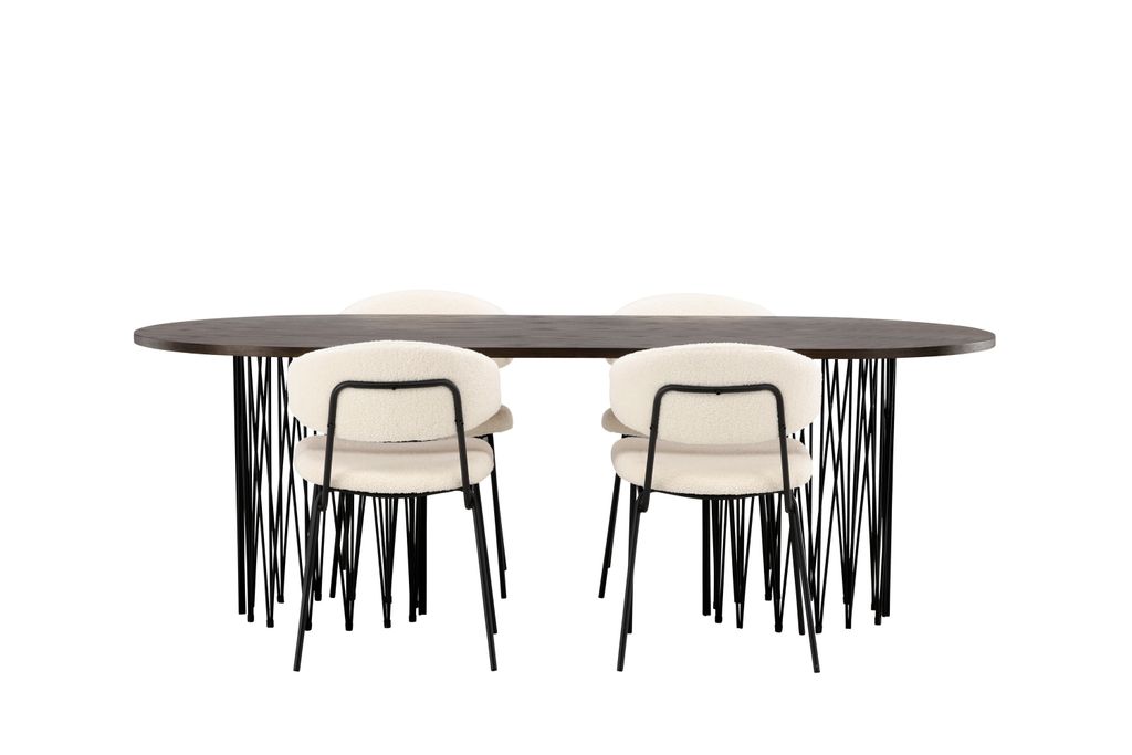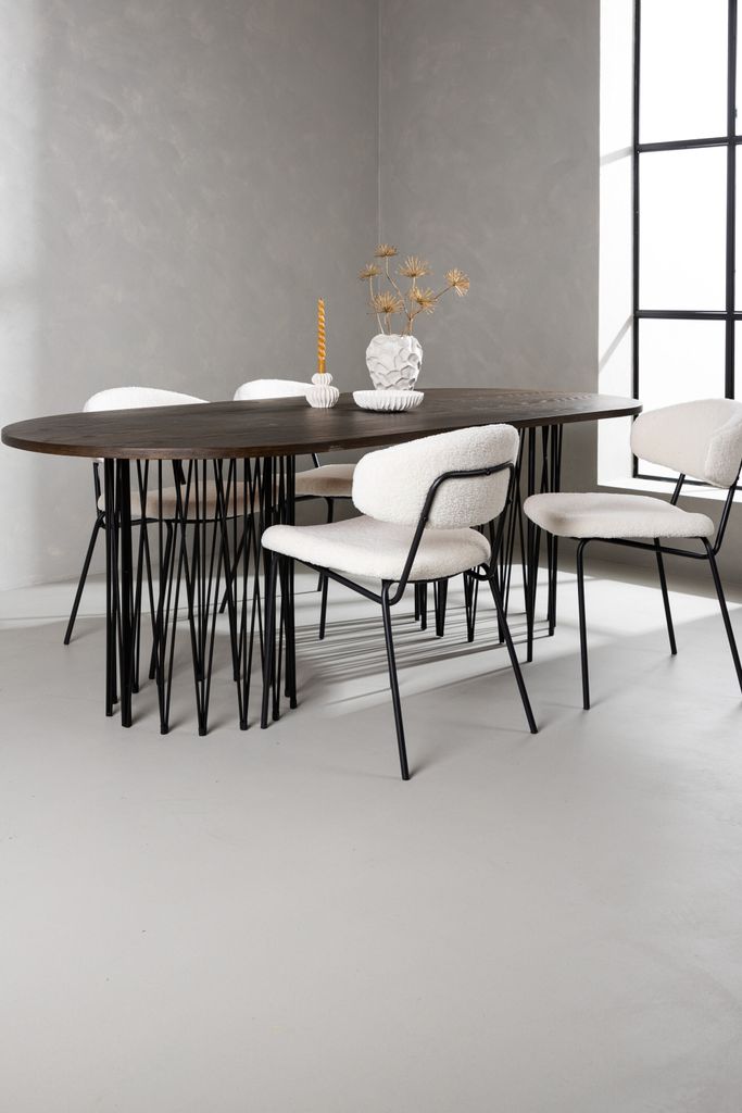 Venture Home Stone Oval Matgrupp kombinerar stil och funktionalitet i en fantastisk design. Det ovala bordet har en elegant brunfärgad bordsskiva i MDF med faner, vilket ger en varm och inbjudande känsla. De två cylinderformade stommarna i svart metall ger stabilitet och kontrast till den mjuka bordsskivan. Vårt bord kompletteras perfekt med de moderna stolarna från serien Chico. Stolarna har en minimalistisk form med en rygg och sits täckt i vitt boucletyg, vilket ger både komfort och en trendig look. Den smala stommen i svart stål förstärker den samtida känslan och matchar bordets design utmärkt. Denna matgrupp är idealisk för att skapa ett mysigt och stilrent blickfång i ditt hem.