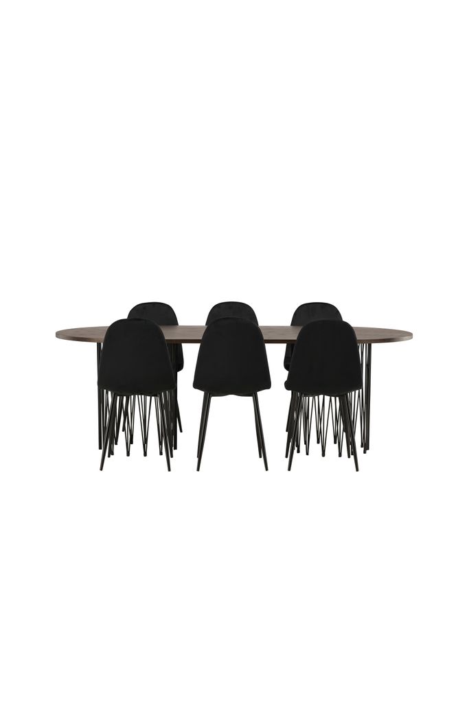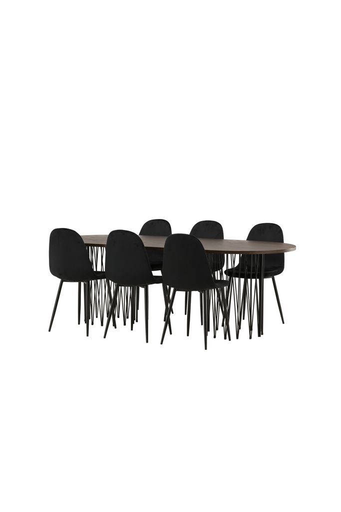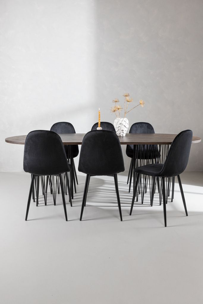 En stilfull matgrupp med brun MDF-bordsskiva och svarta sammetstolar, perfekt för en modern atmosfär.
