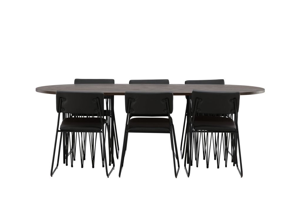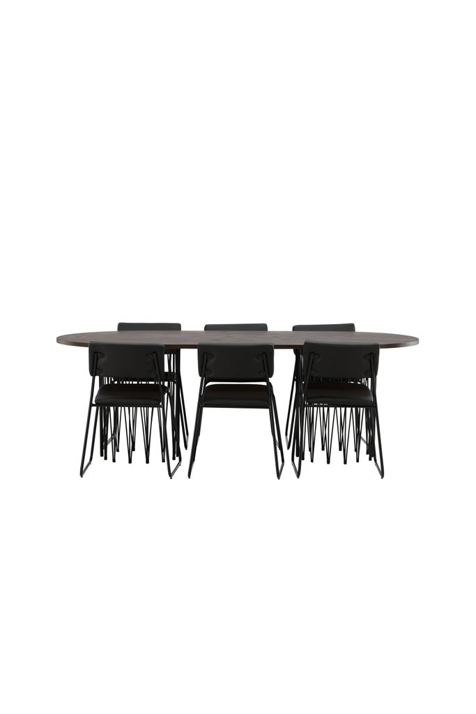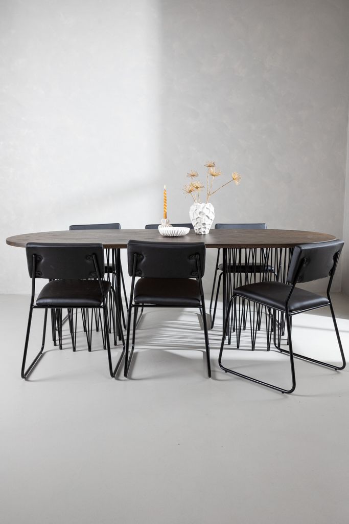 Skapa en inbjudande och social atmosfär i ditt hem med Venture Home Stone Oval Matgrupp. Det eleganta matbordet har en brunfärgad bordsskiva i MDF med faner, vilket ger en varm och naturlig känsla. Två cylinderformade stommar i svart metall ger stabilitet och en modern touch.