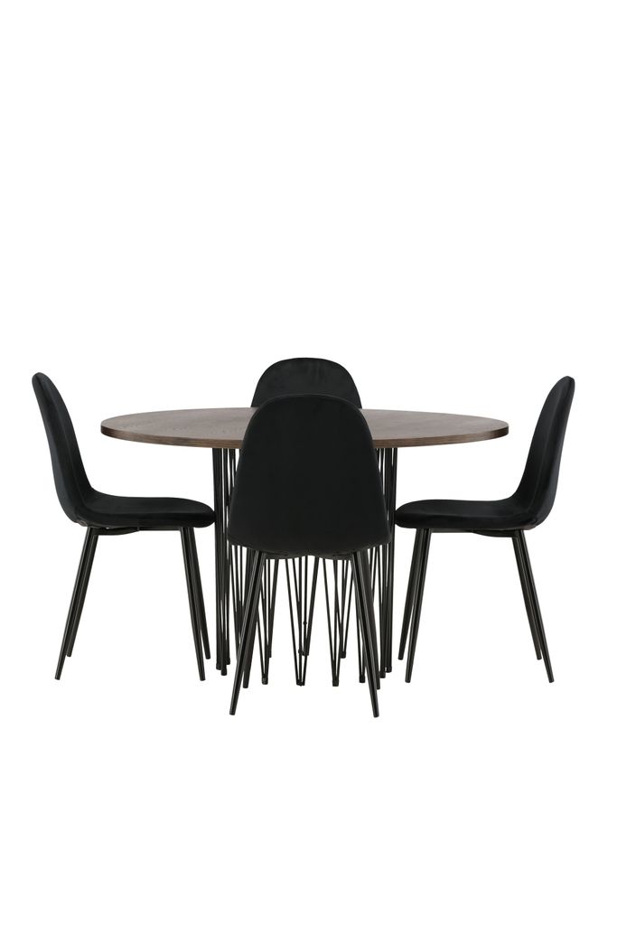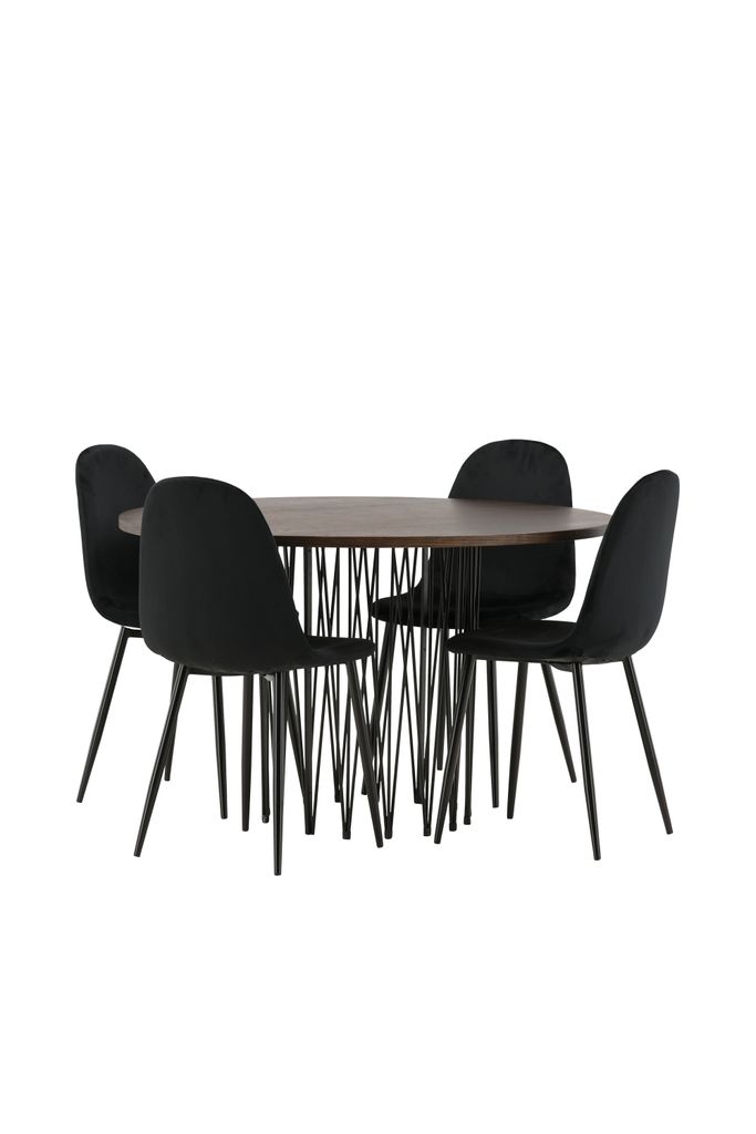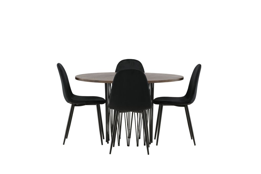 De tillhörande stolarna har en helklädd design med en rundad rygg och sits i svart sammetstyg. Den mjuka stoppningen och de stabila benen i svart pulverlackerad metall säkerställer långvarig komfort utan att kompromissa med stilen.